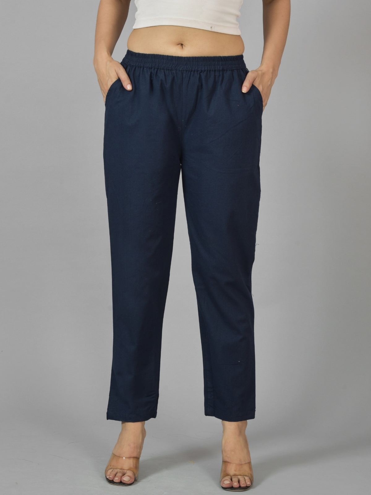 Pack Of 2 Womens Navy Blue And Pink Deep Pocket Fully Elastic Cotton Trouser