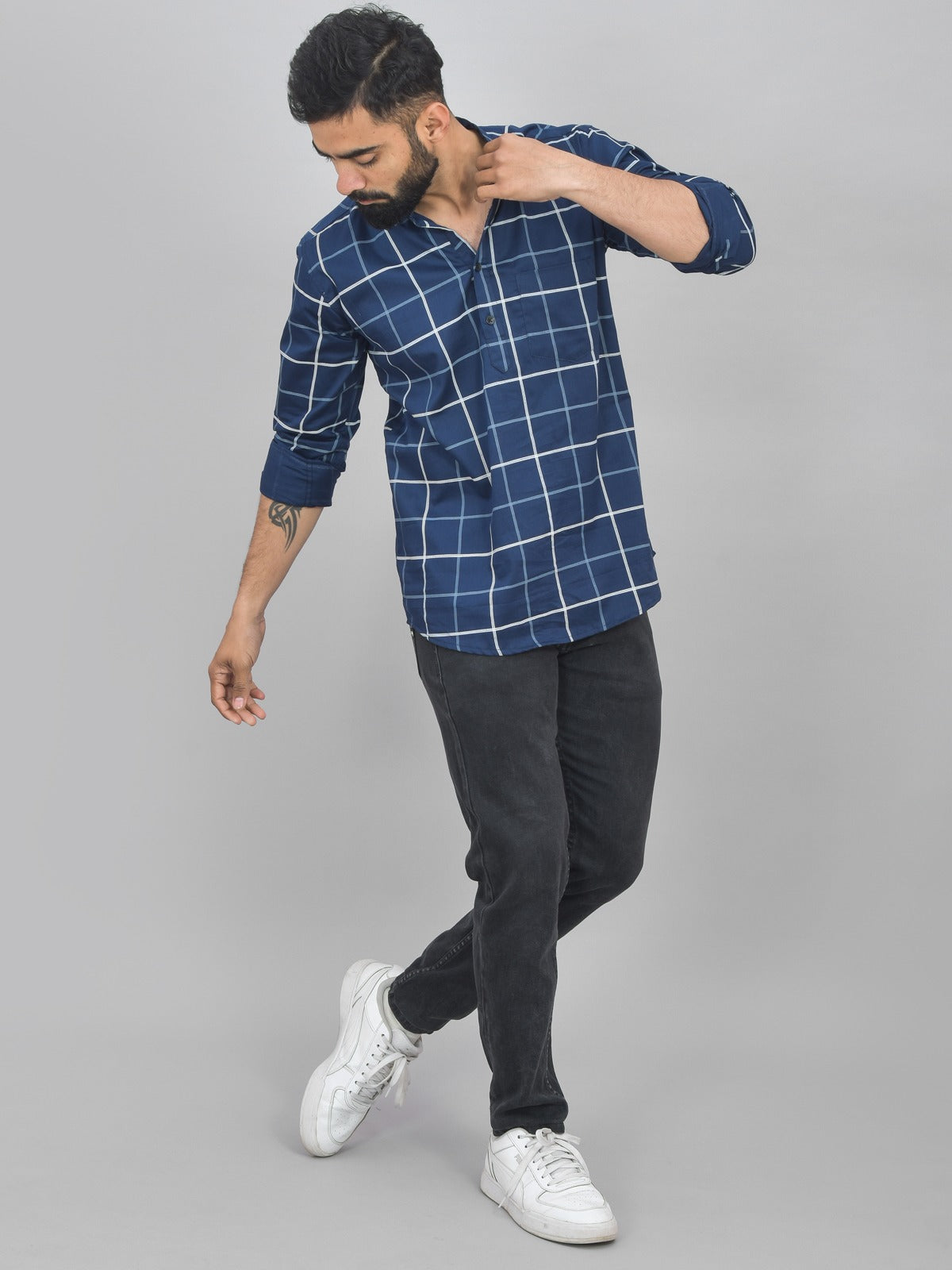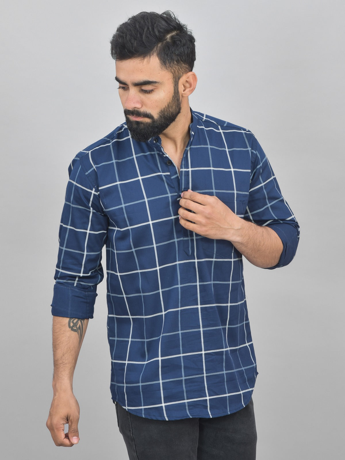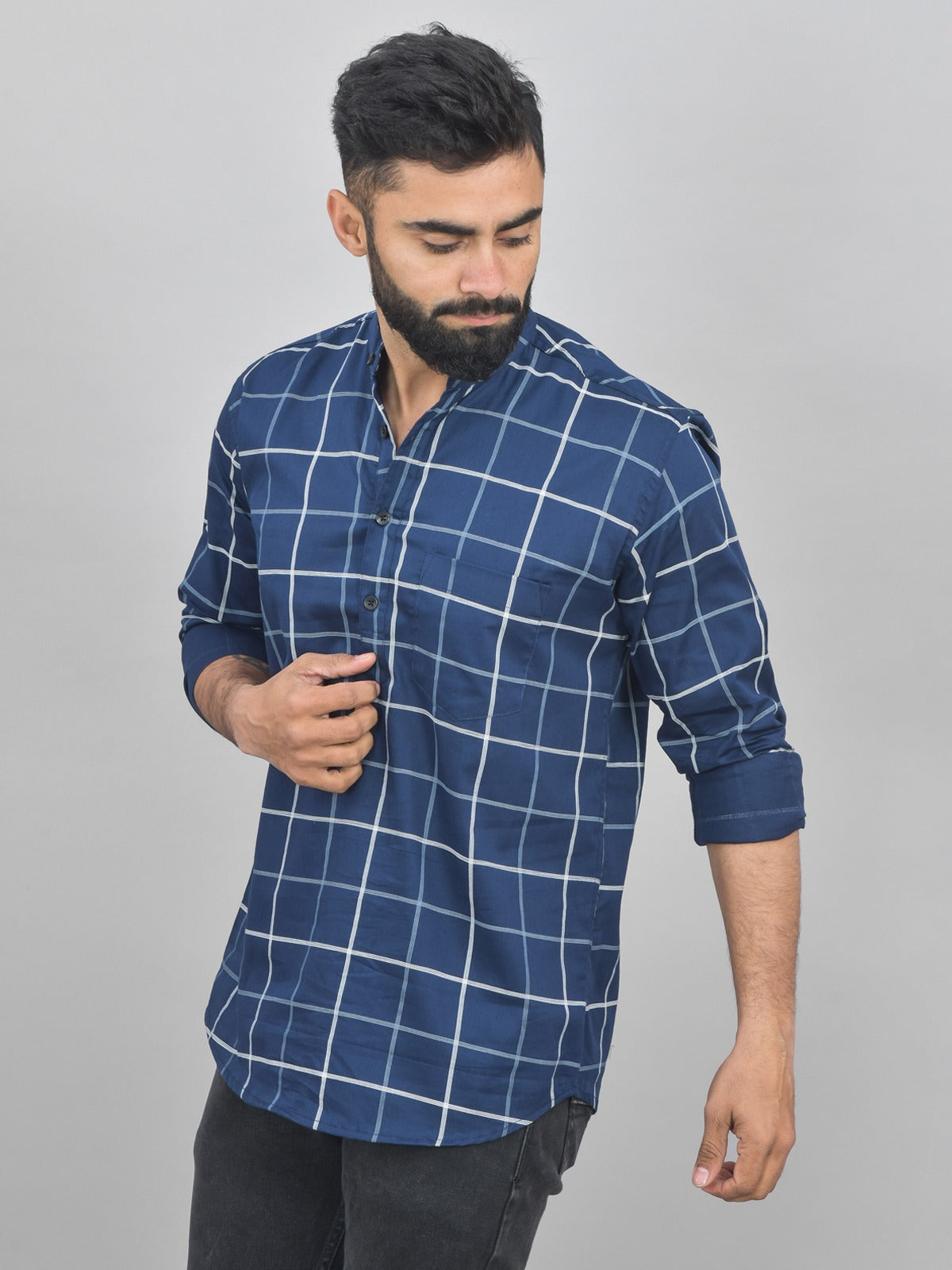 Explore classic fashion with our newest Mens Full Sleeve Short Kurta. This beautifully made kurta with wide checks will elevate your wardrobe. The mandarin collar gives an updated touch that strikes the ideal blend between personalised and modern style. This carefully crafted cotton kurta guarantees breathability all day long. In addition to improving functionality, the well-considered addition of a chest pocket gives the entire design a fashionable touch. Enjoy this kurta's versatility as it can be worn to semi-formal and casual events. It becomes a focal point in your collection with the slight flair added by the curved hem. With this essential wardrobe piece, you can up your style bar. Shop now to reinvent your look with our Kurtas, which seamlessly combine style with ease.
