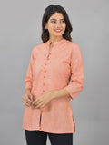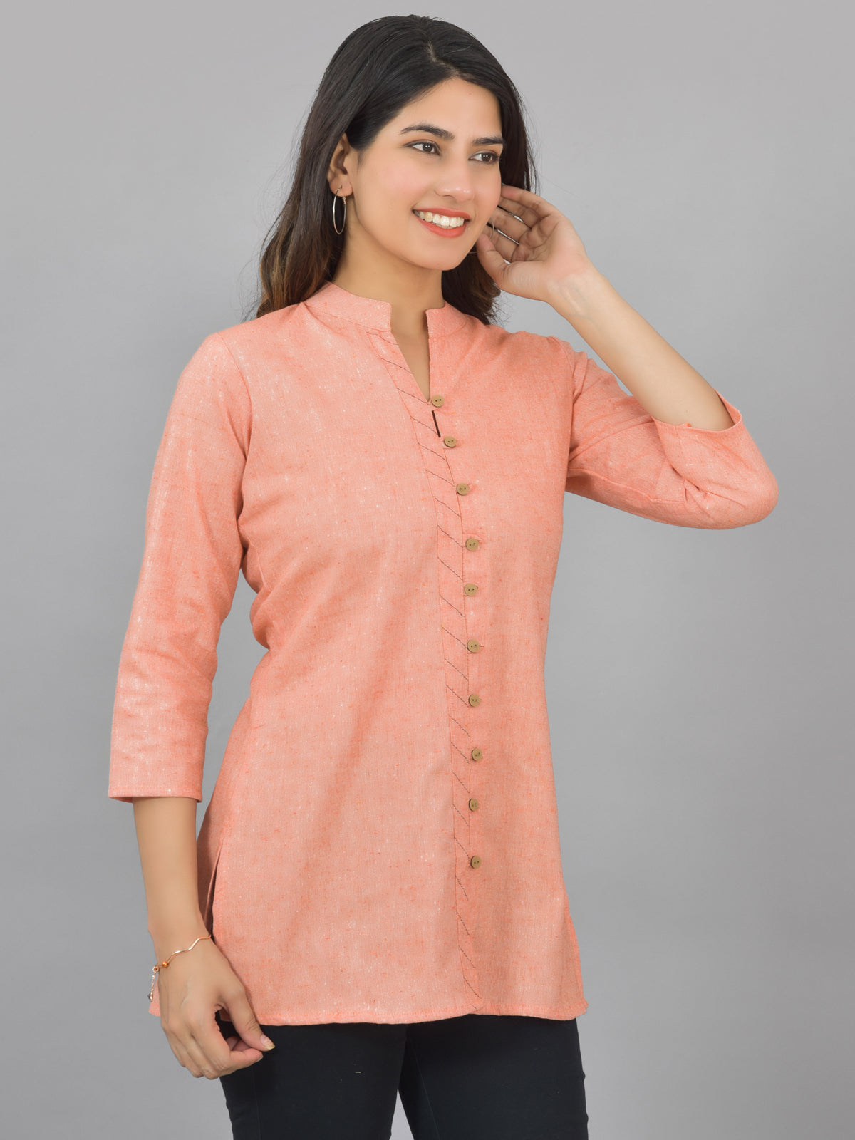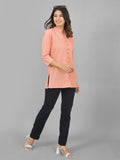 This Quaclo Women's Short Kurti is expertly woven from the finest handloom cotton and will be a good choice to be added in your ethnic collection. This elegant kurti has a convenient 30-inch length, making it ideal for all-day wear and for small get togethers/functions as well. The glorious woven design on the front, combined with gorgeous buttons and a fashionable front-slit style, makes it complete. This outstanding addition to your wardrobe provides the ideal balance of comfort, style, and tradition at the same time.