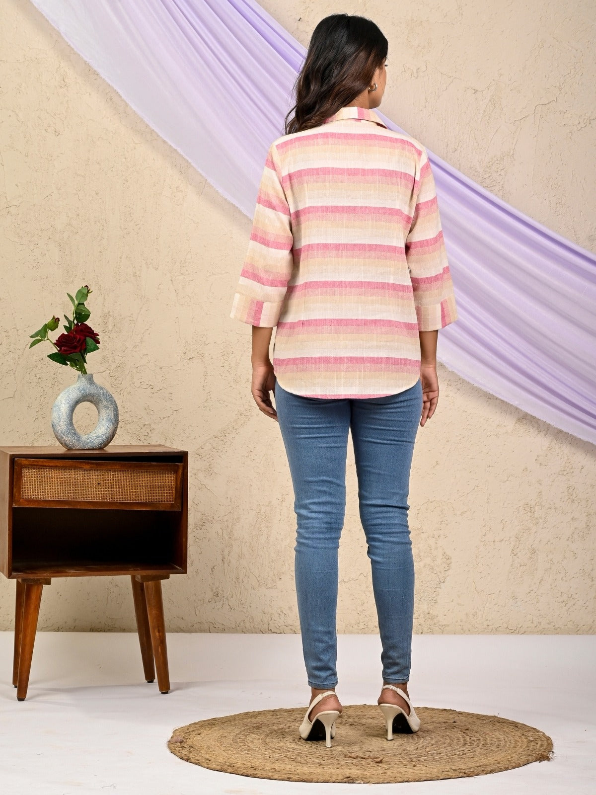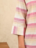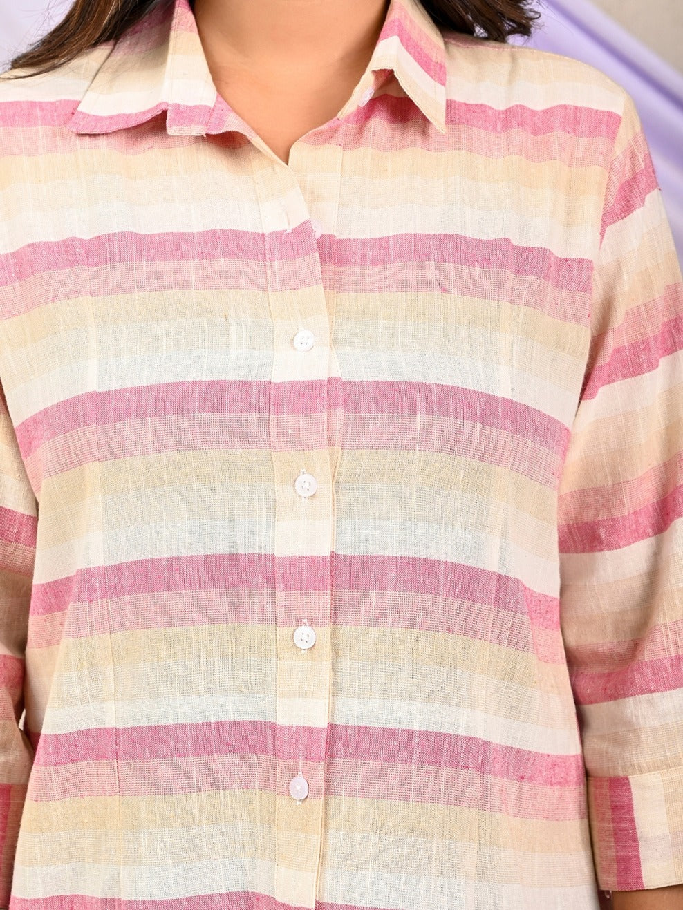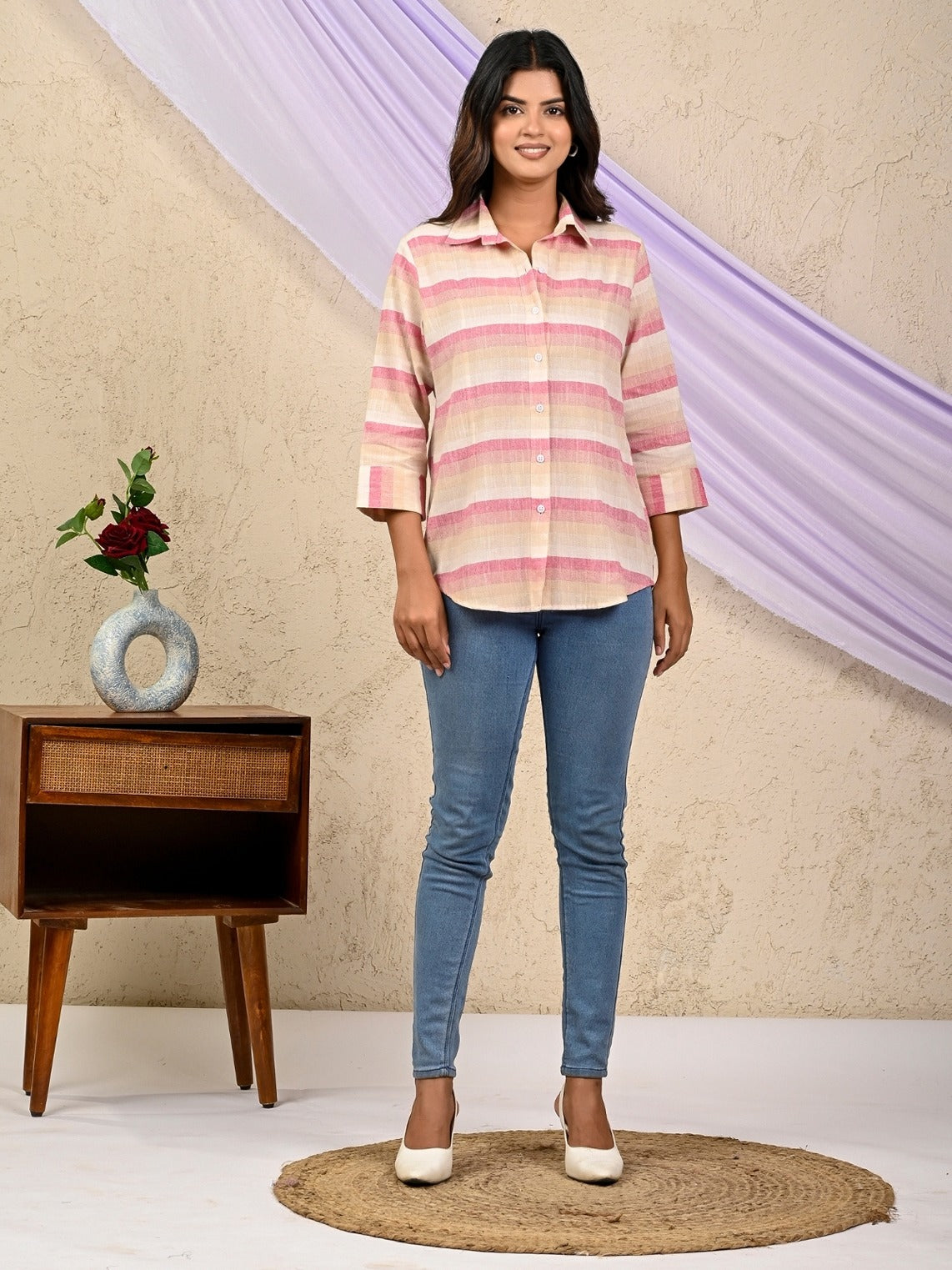 Discover the ideal fusion of comfort and style with our women's multi-striped linen cotton shirt. This item, with its three-quarter sleeves and spread collar, is perfect for any semi-formal or casual setting. The horizontal line stripe pattern gives your wardrobe a stylish, contemporary touch while maintaining a classic appearance. This shirt's breathable linen-cotton material ensures maximum comfort all day long. The front button closure guarantees adjustability and comfort of wear. For a refined look, pair it with fitted pants or jeans. A wardrobe staple for every season, this airy and fashionable shirt is perfect for both work and weekend excursions. Today, add this chic multi-striped shirt to your wardrobe!