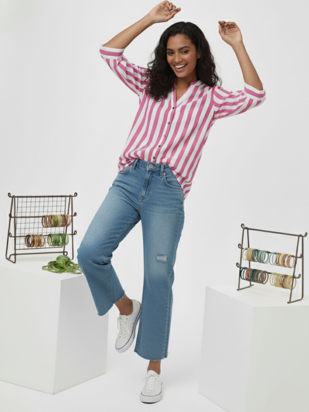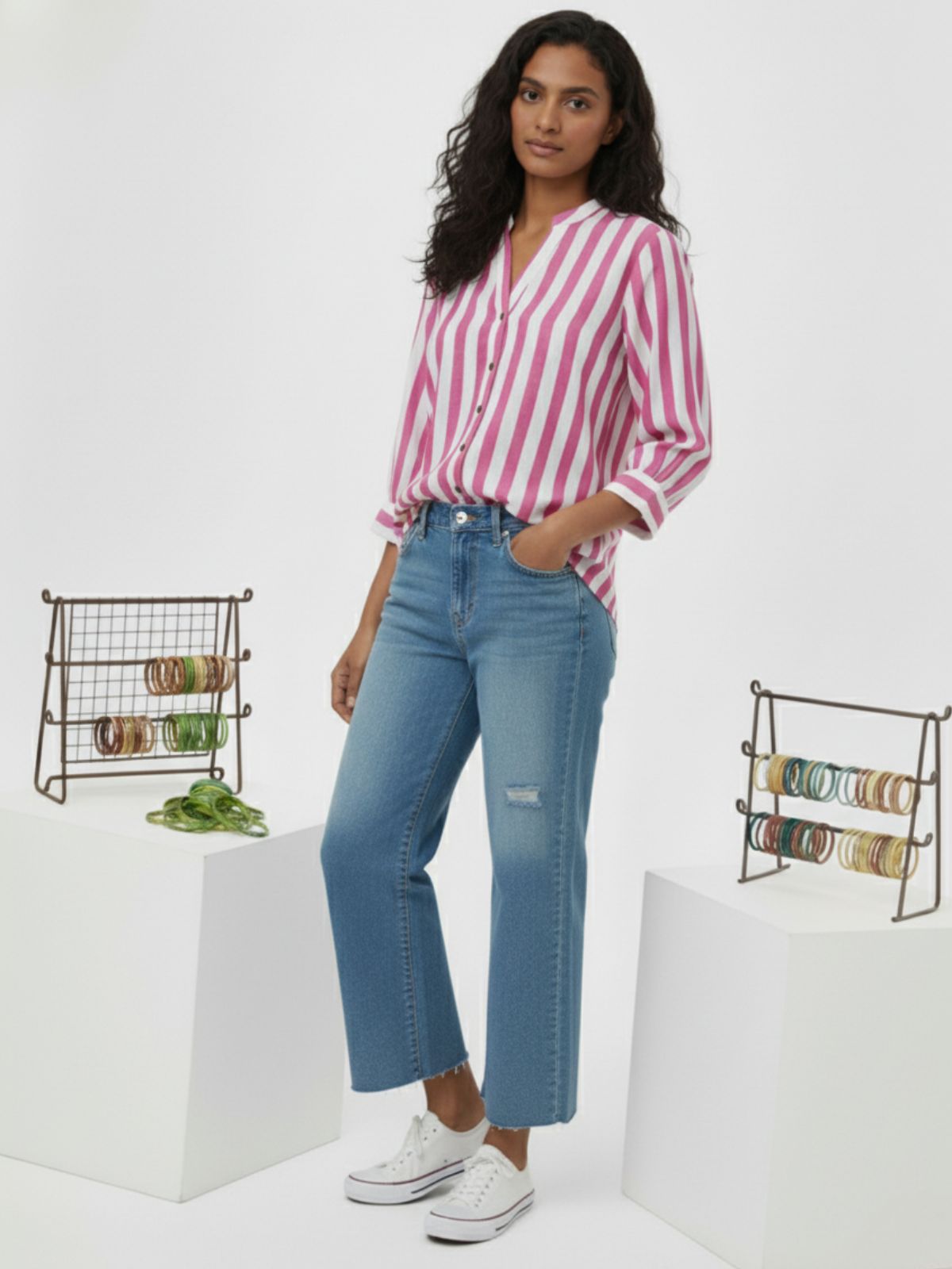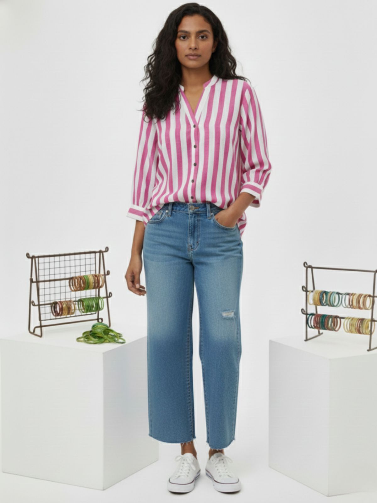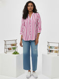 Discover effortless elegance with our Women’s Stripe Shirt featuring stylish shoulder pleats, 3/4th sleeves, and a classic button closure. Designed for both comfort and sophistication, this hip-length shirt offers a flattering fit for any occasion. Crafted from soft, breathable fabric, it blends timeless stripes with modern detailing, making it perfect for office wear or casual outings. Pair it with trousers or jeans for a chic, polished look that enhances your everyday style effortlessly.