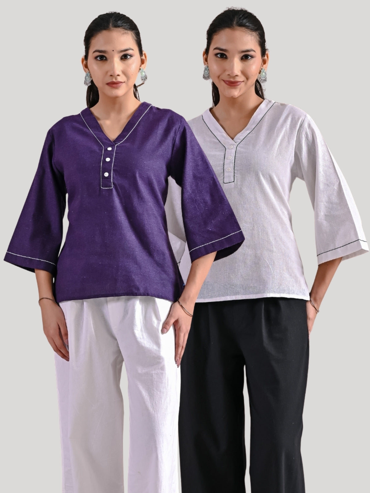 Pack Of 2 Purple And White Handloom Cotton Anchor Thread Designer Tops