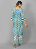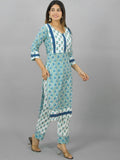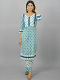 Womens Royal Blue Flower Printed V Neck Kurta and Pant Set