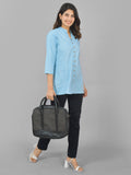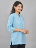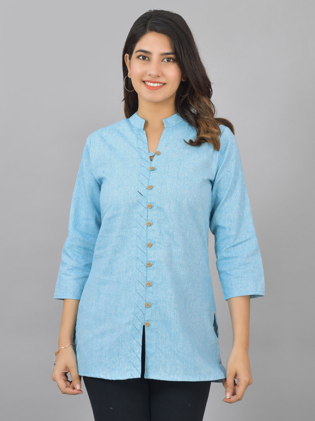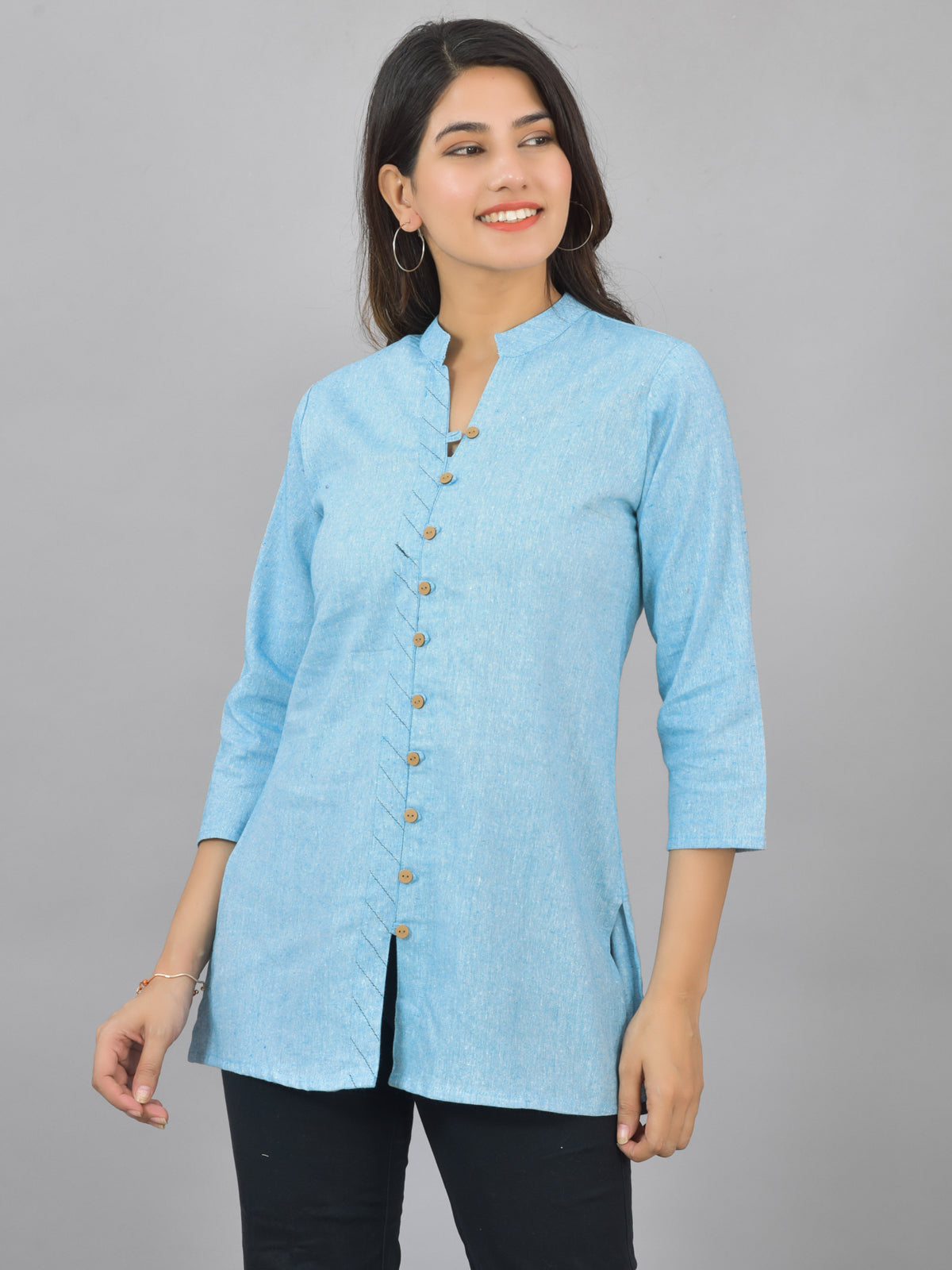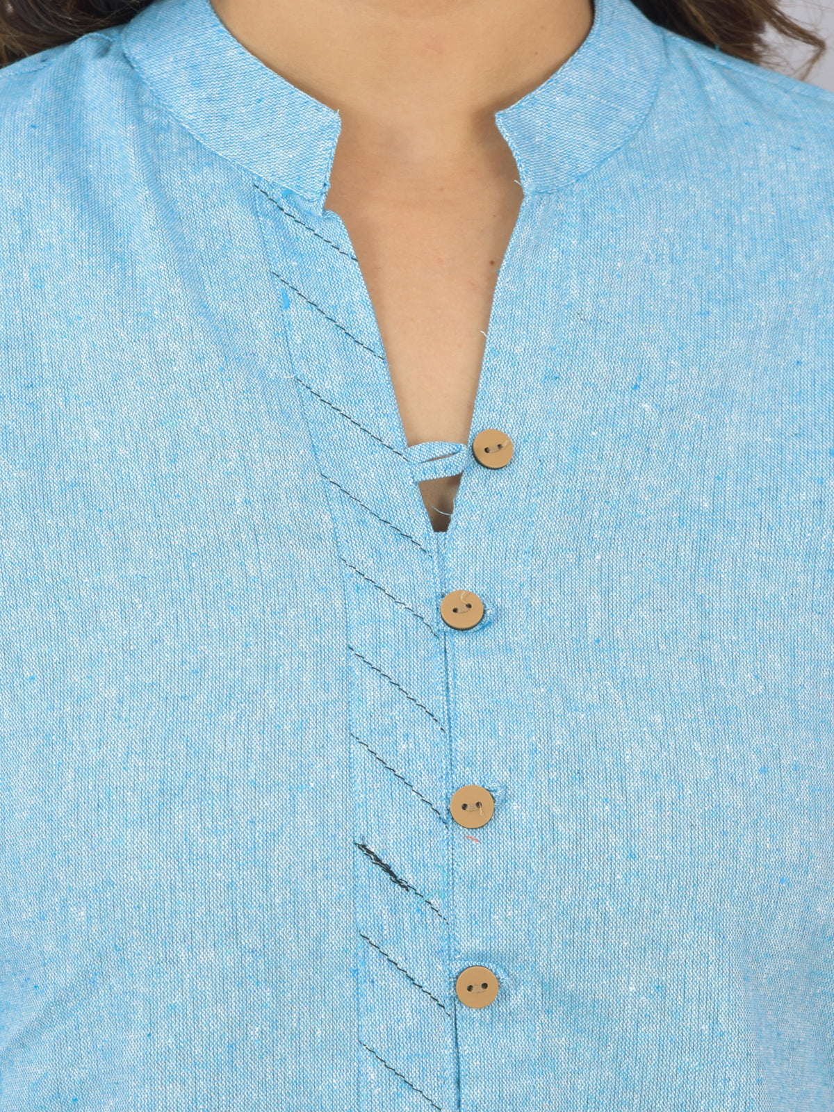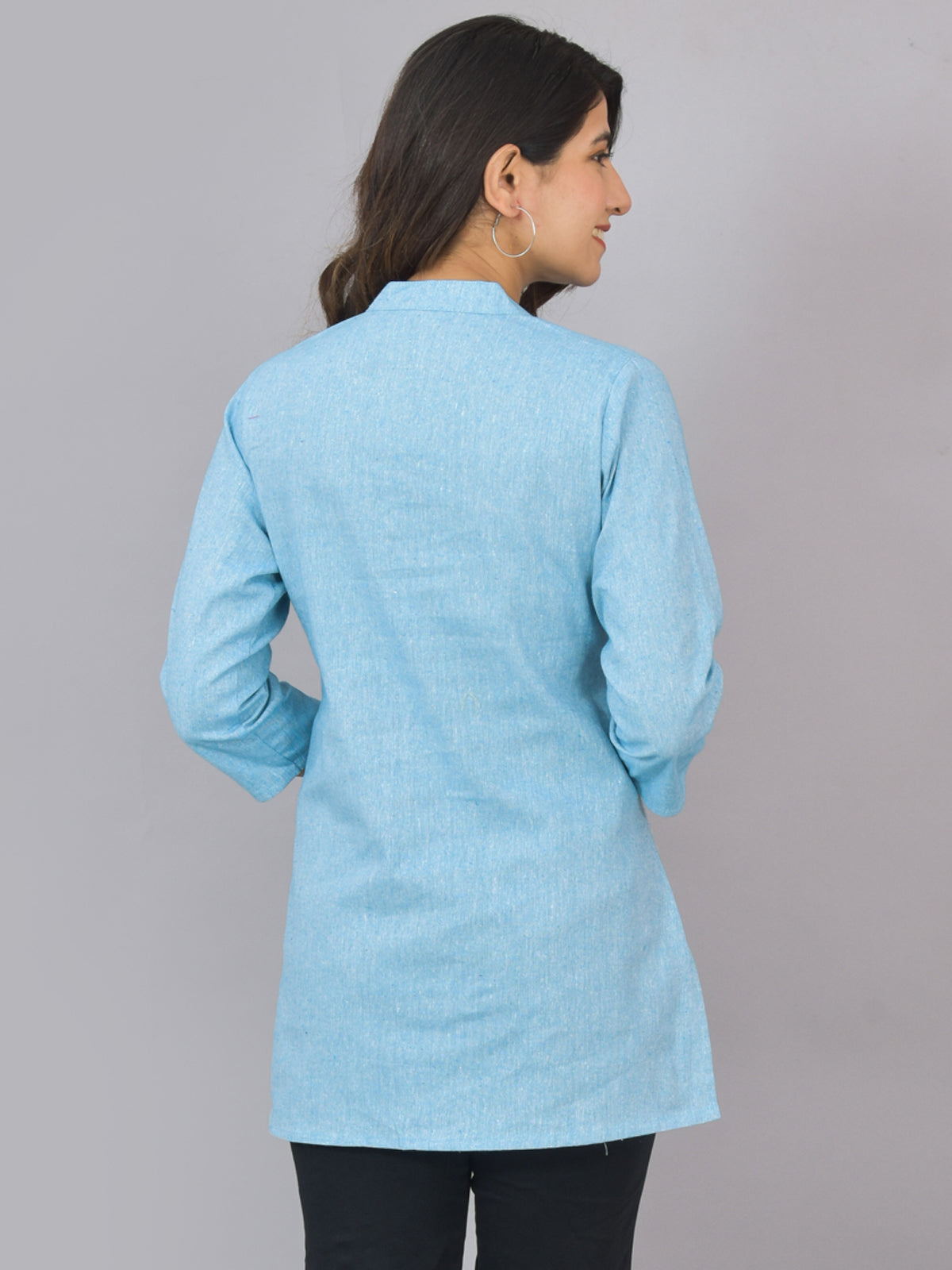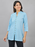 Womens Sky Blue Woven Design Handloom Cotton Frontslit Short Kurti