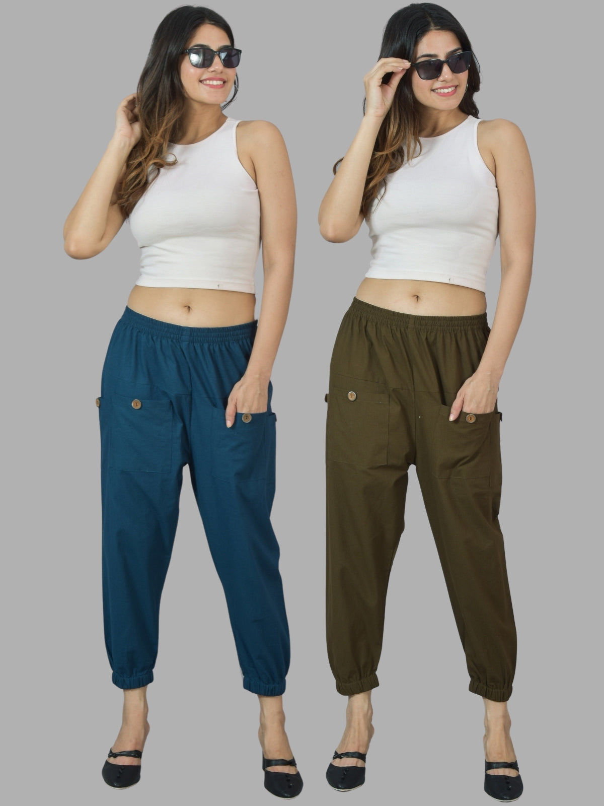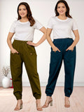Combo Pack Of Womens Teal Blue And Dark Green Four Pocket Cotton Cargo Pants