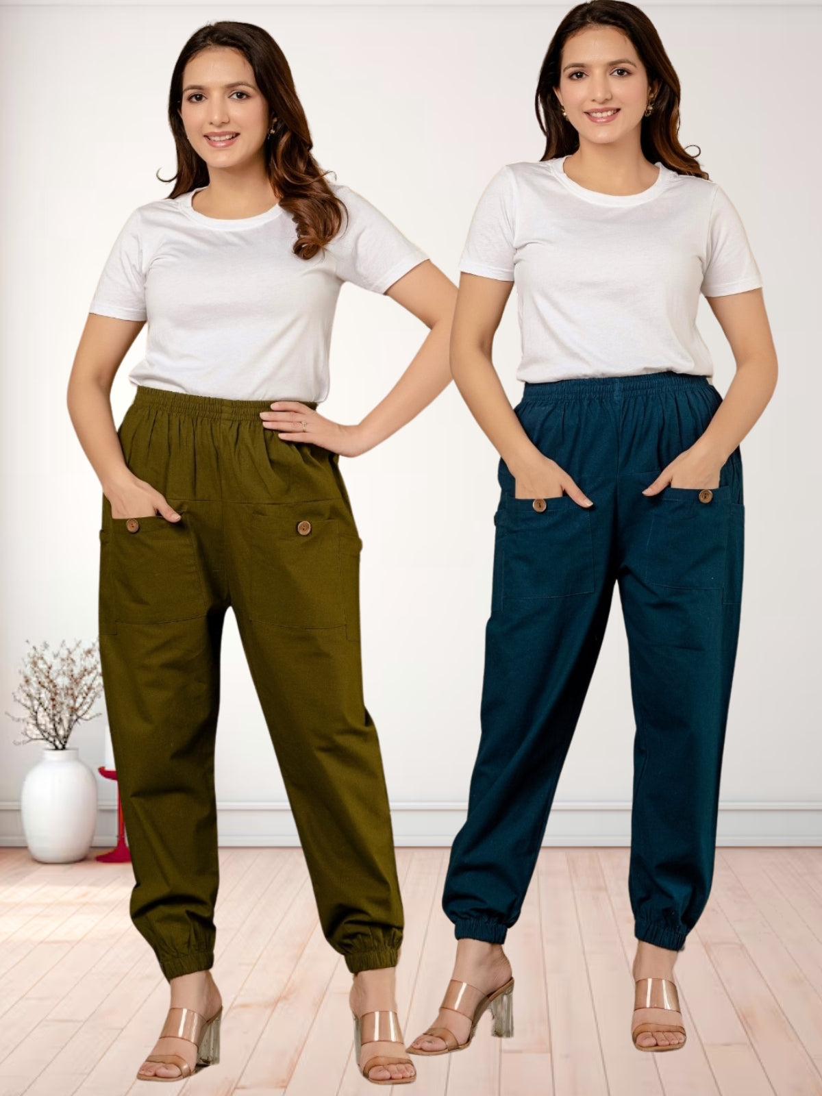 Quaclo's Combo Pack Of Womens Four Pocket Cotton Cargo Pants will amaze you with its unmatched comfort and style. The softness and breathability of these flexible cargo pants are precisely constructed from the finest pure cotton. While the fully elastic waistband guarantees a perfect fit and extra flexibility, the ankle elastic provides a trendy touch and allows you to show off your preferred shoes. Whether you're relaxing at home, heading out or going on an adventure, these cargo pants are your go-to choice. The Pure Cotton Four Pocket Cargo Pants for Women by Quaclo are the perfect combination of fashion and function. Order this essential item right away as feasible to enhance your entire look.