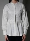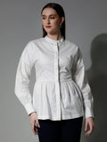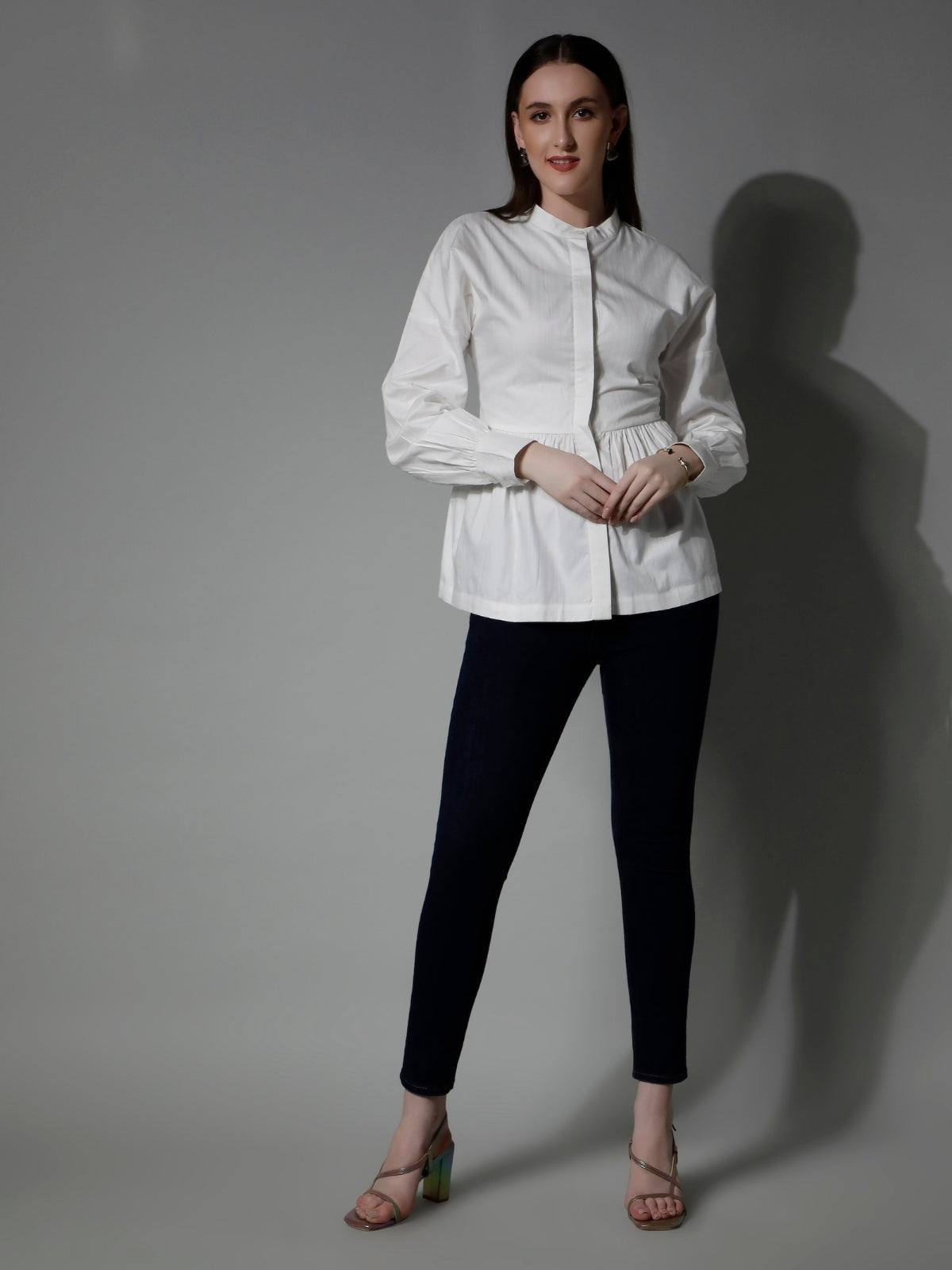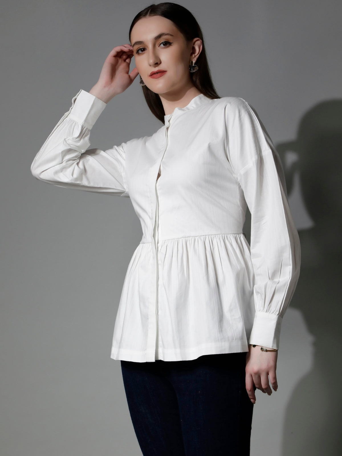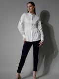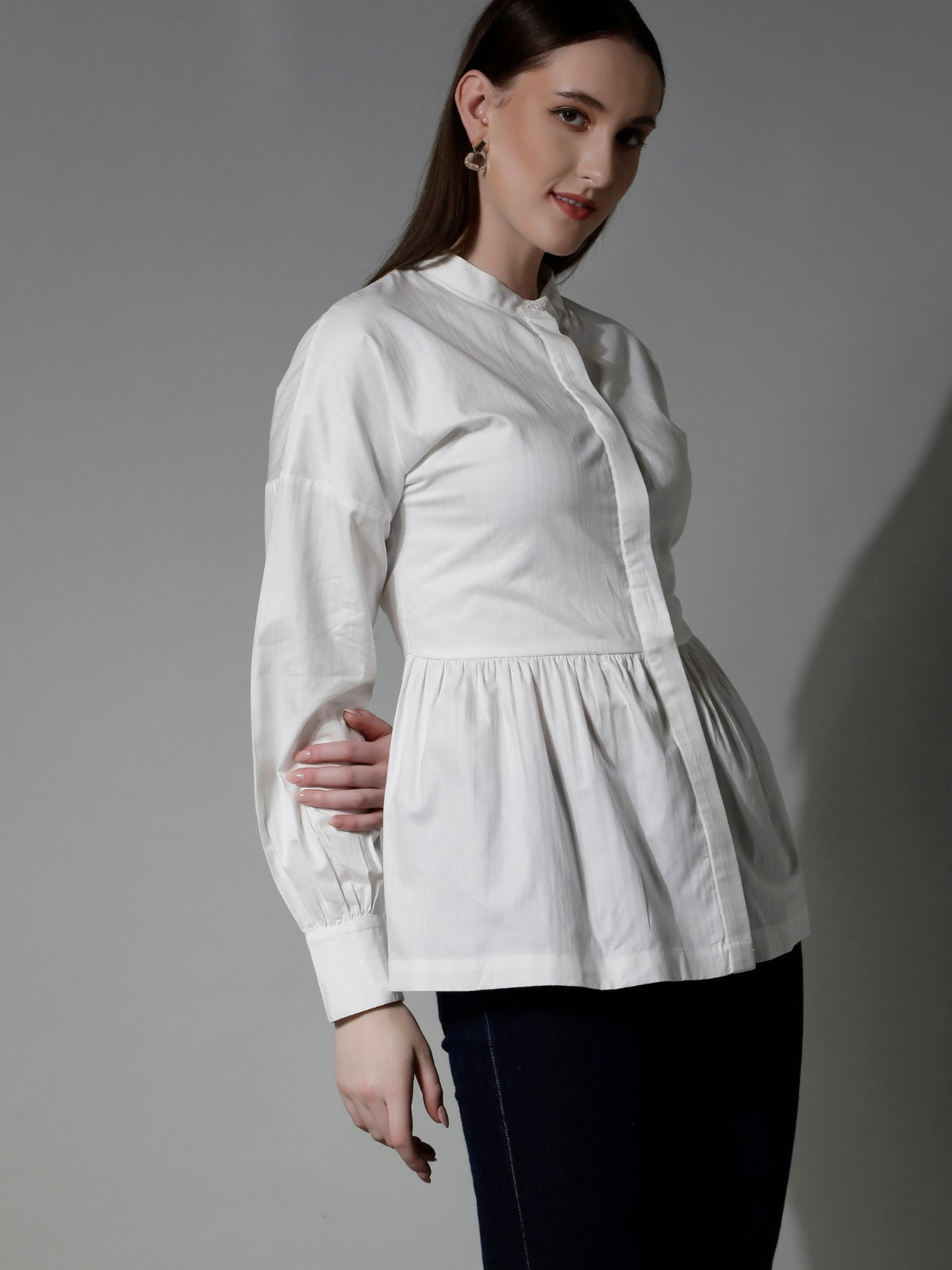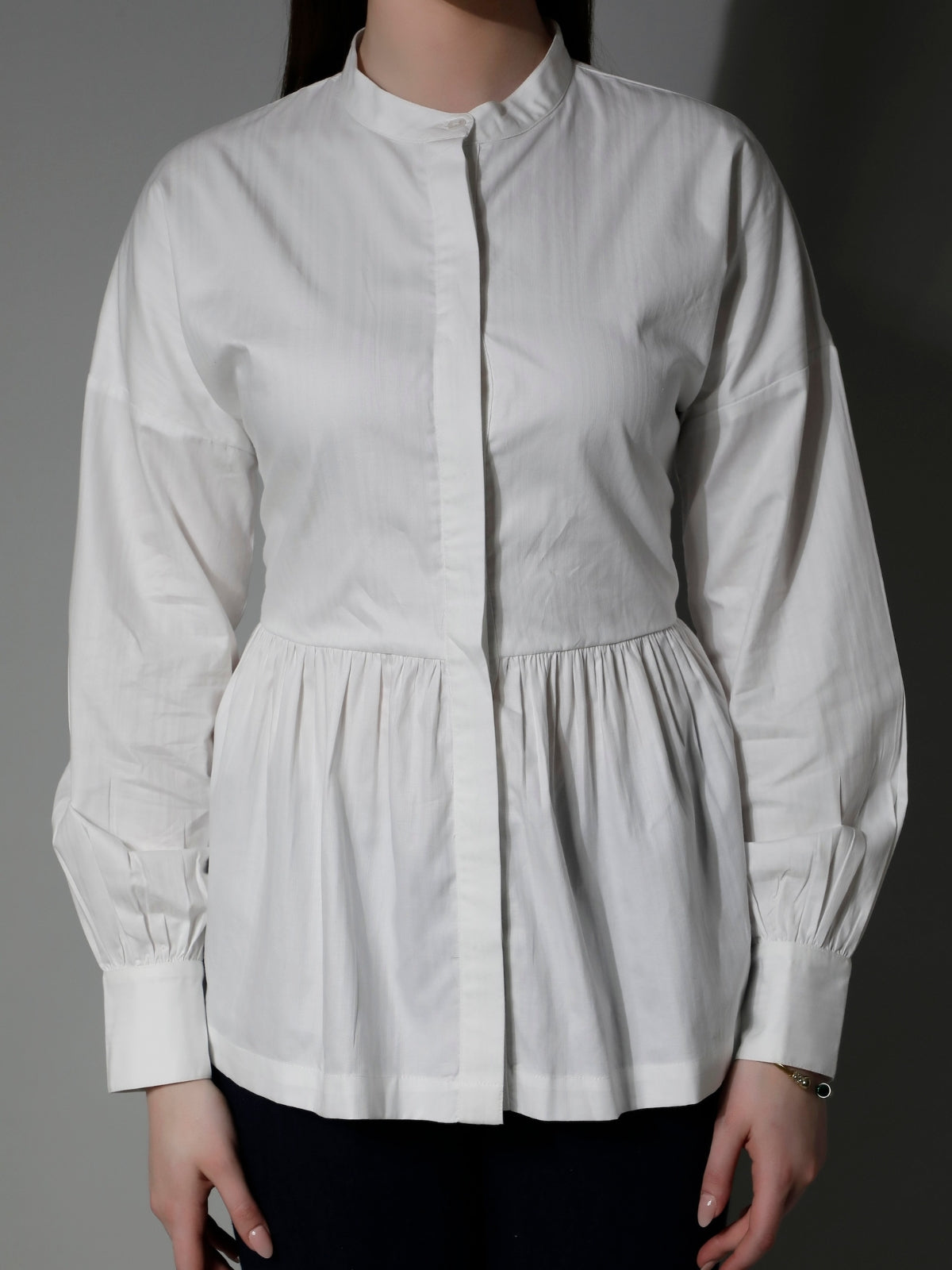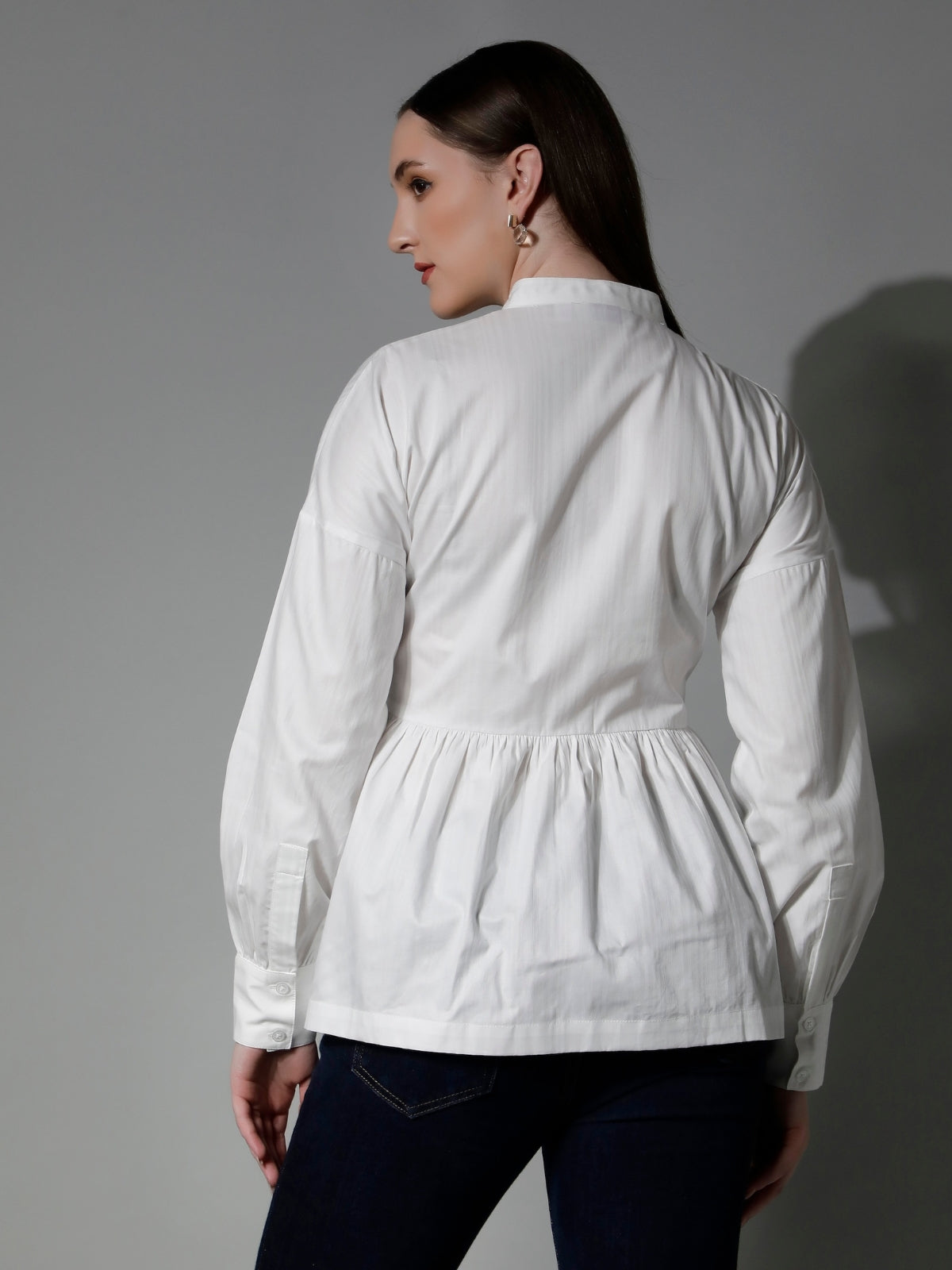 Made from textured stripes cotton fabric, this shirt features a cinched in waist with playful gatherings and relaxed fit.