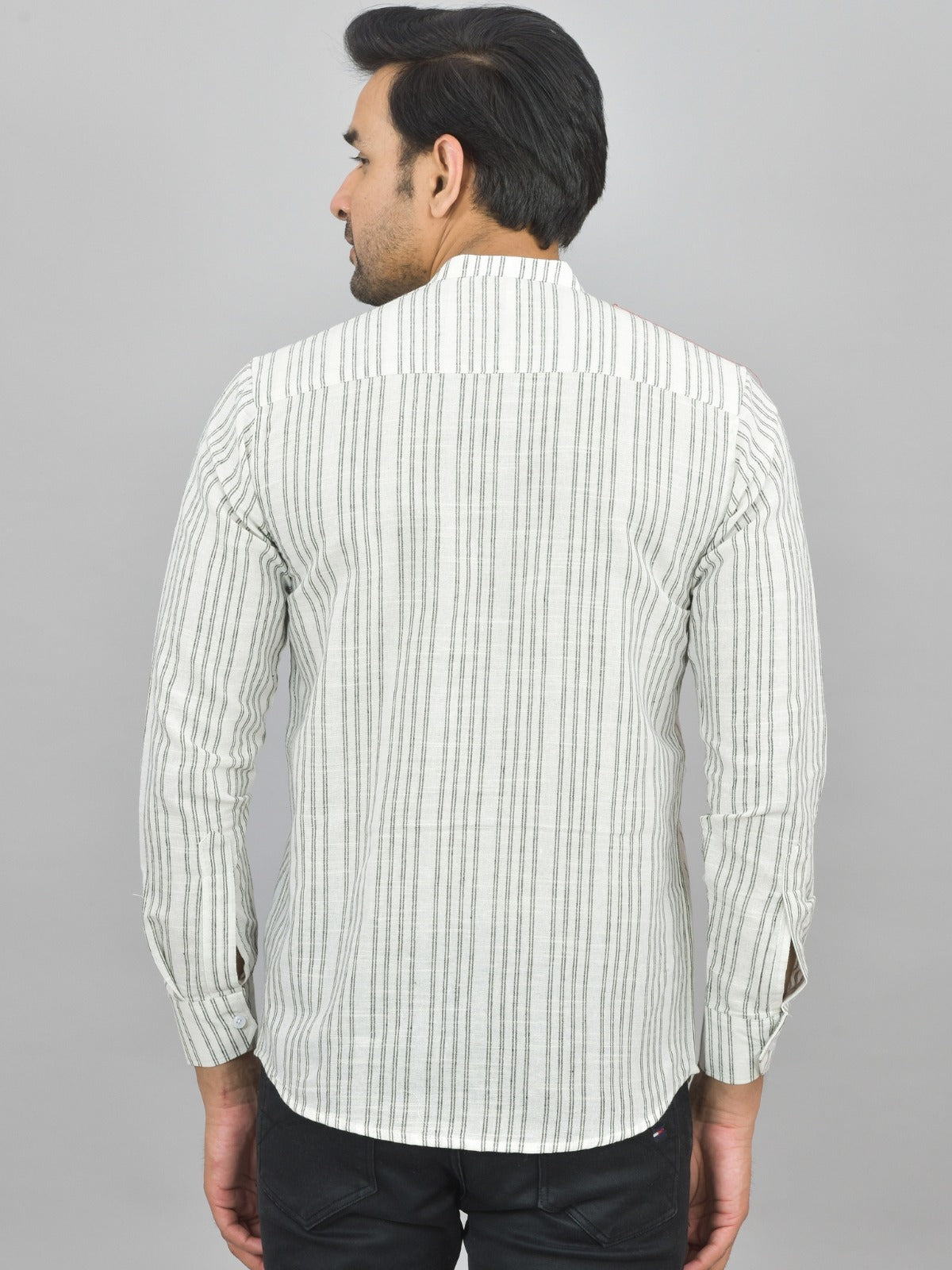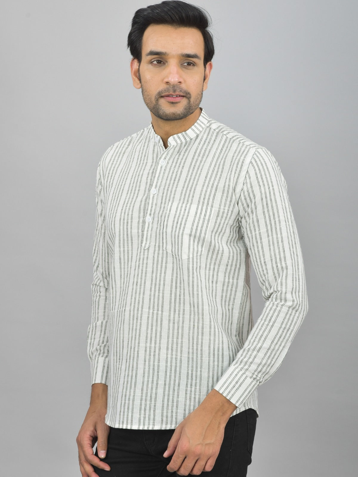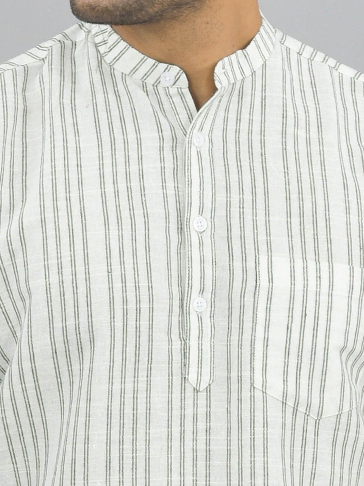 Regular Fit Light Grey Stripes Linen Slub Short Kurta
