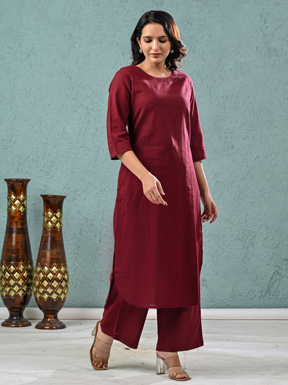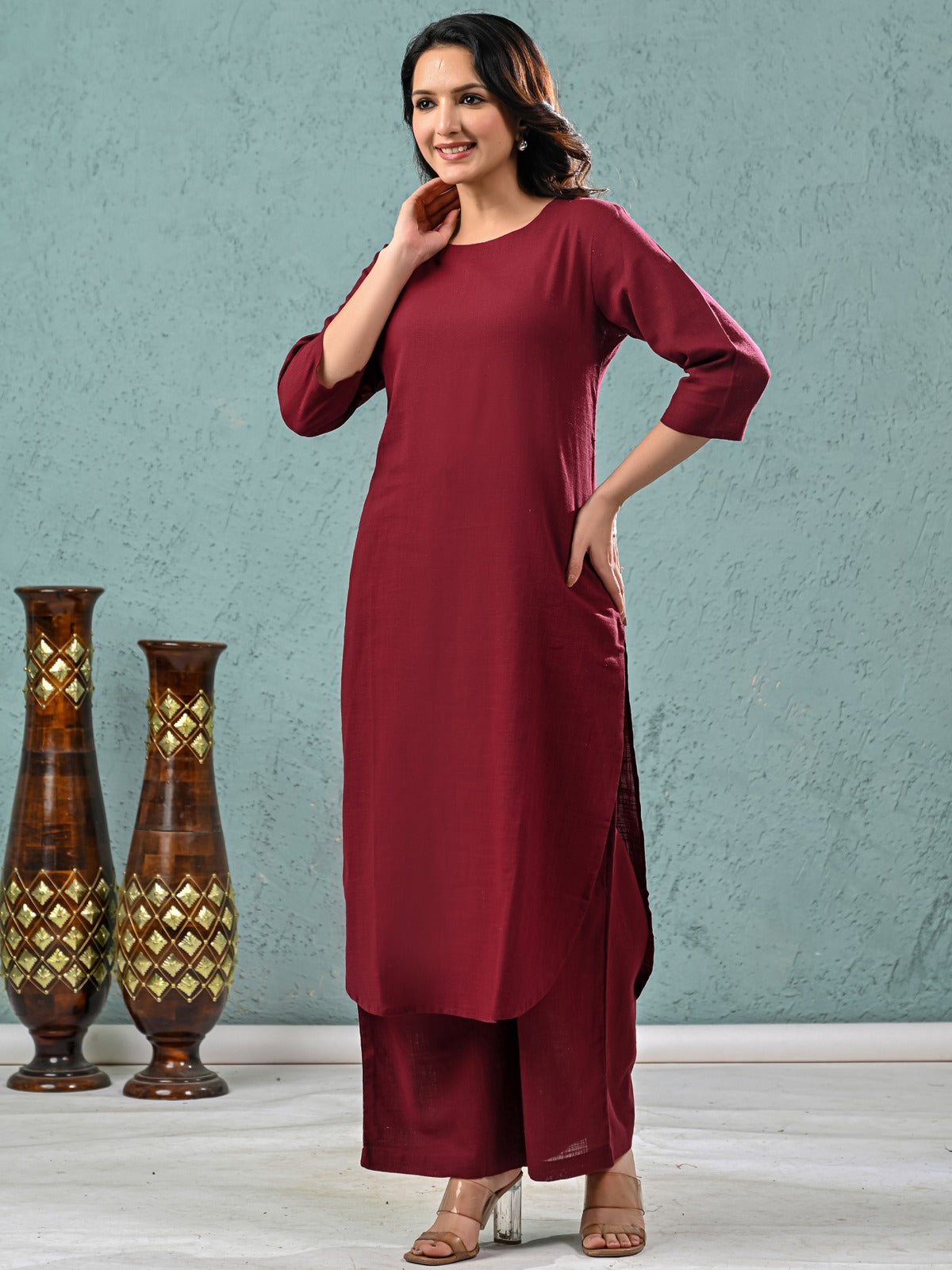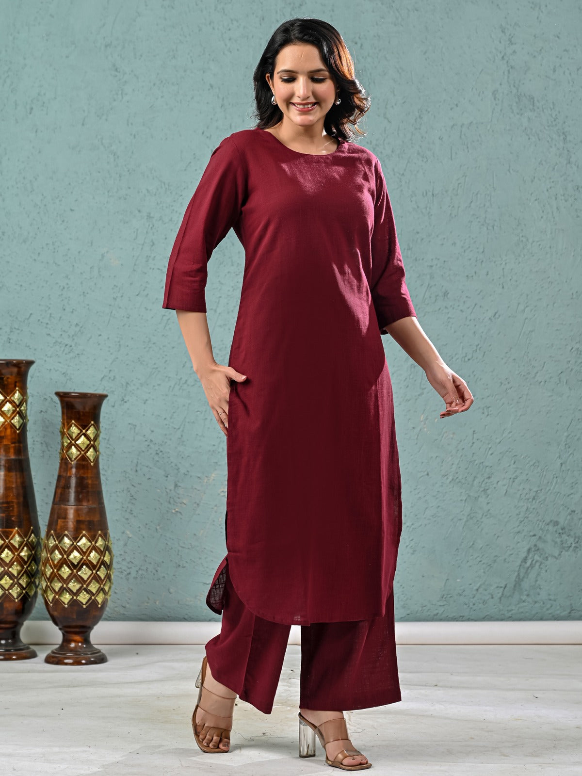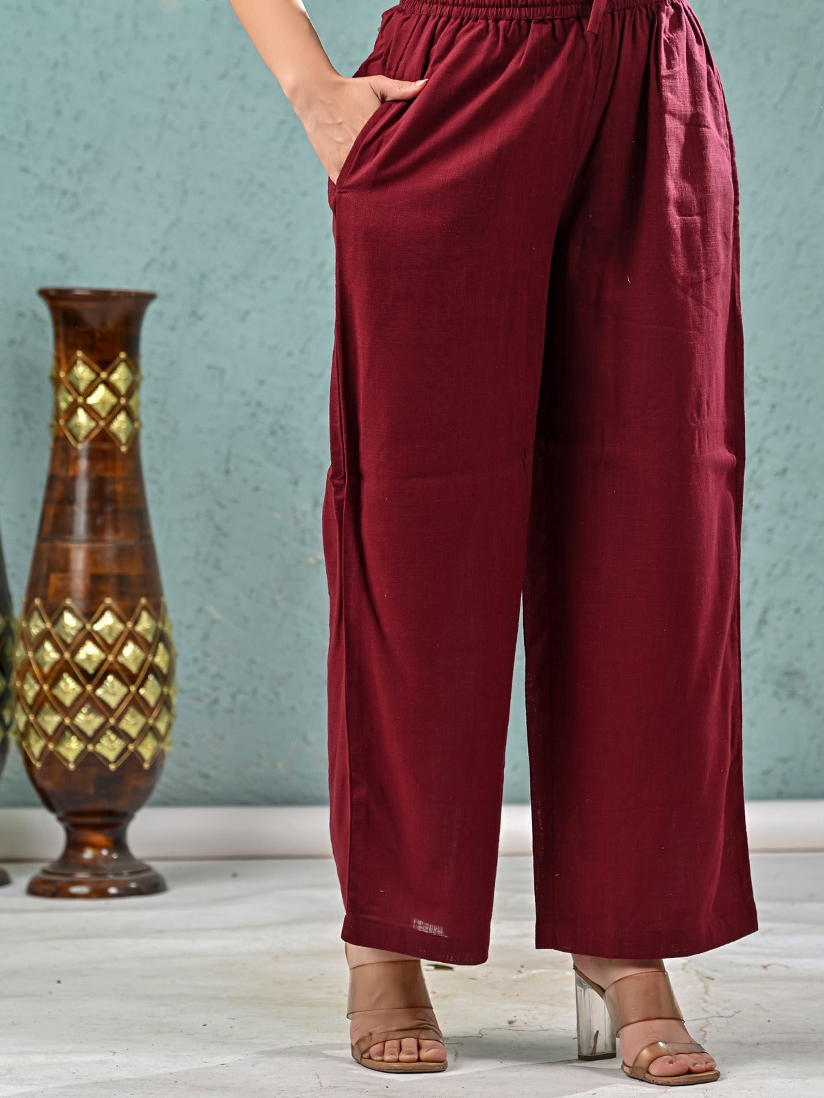 Womens Solid Wine Cotton Kurta Plazzo Set