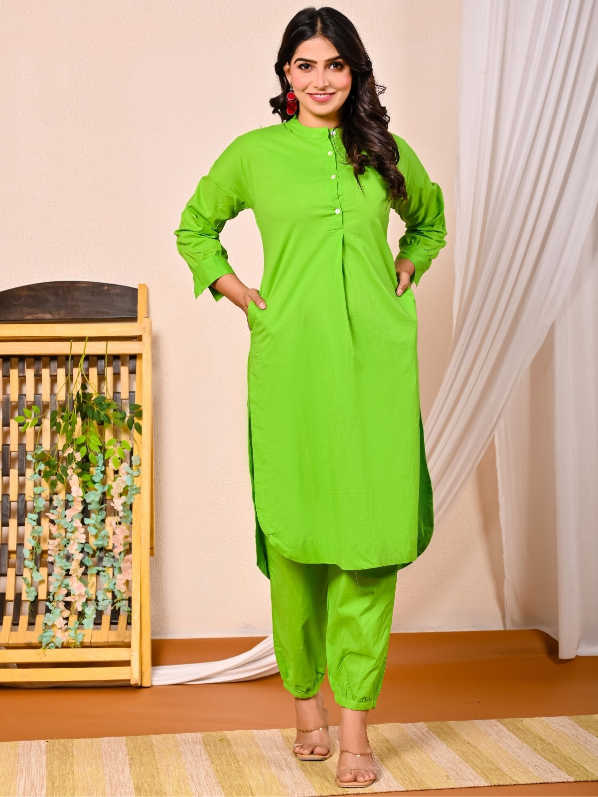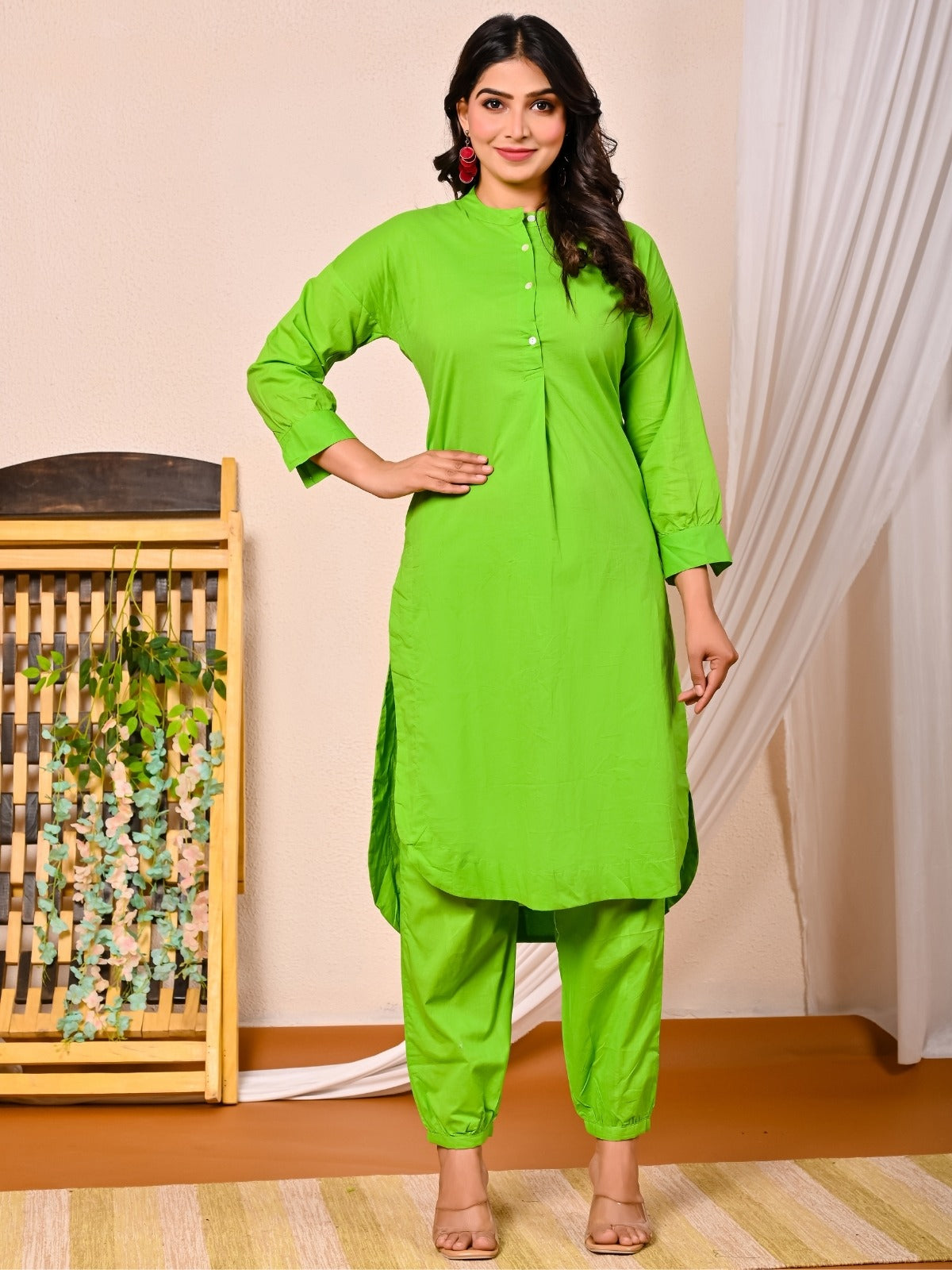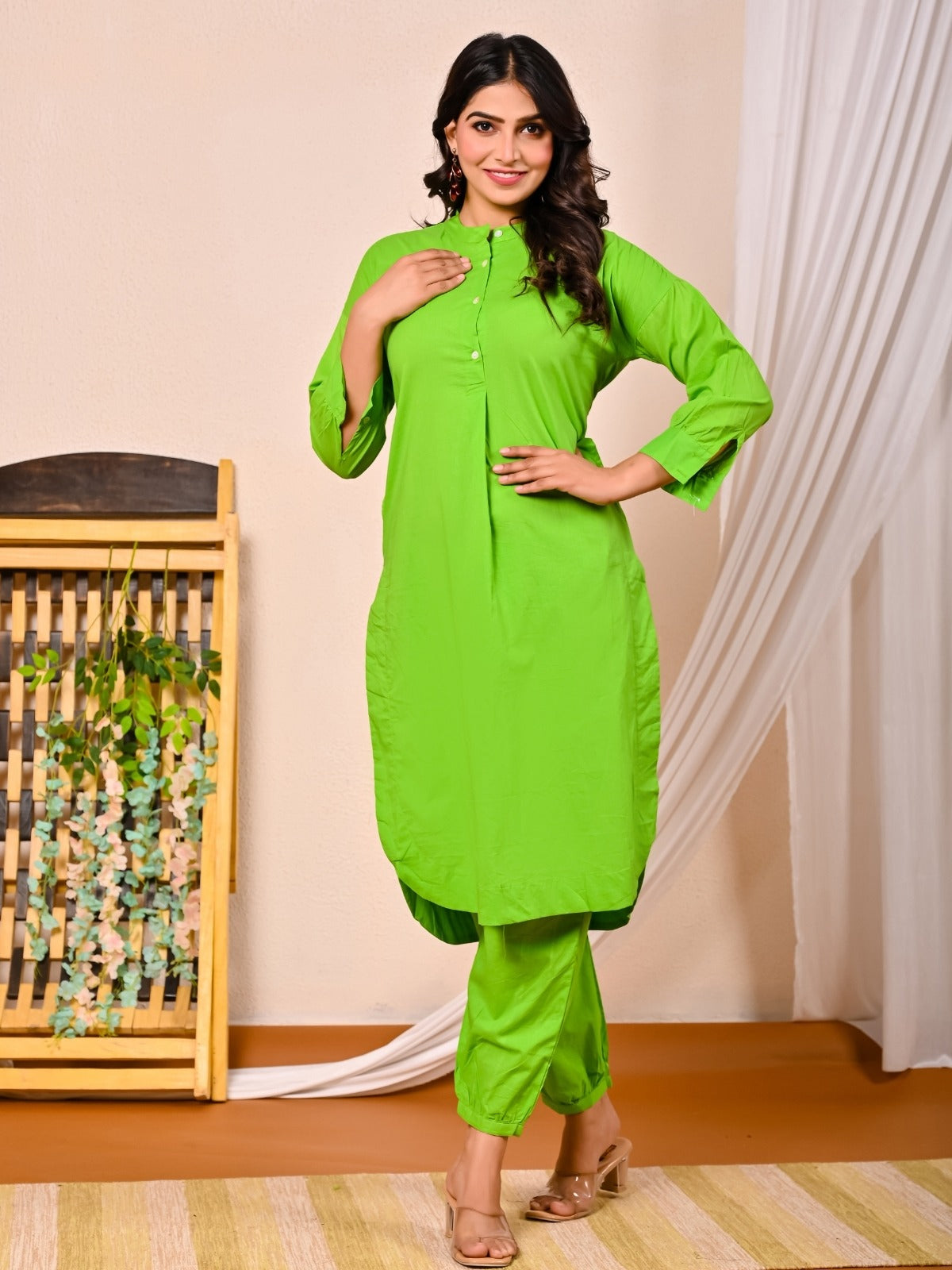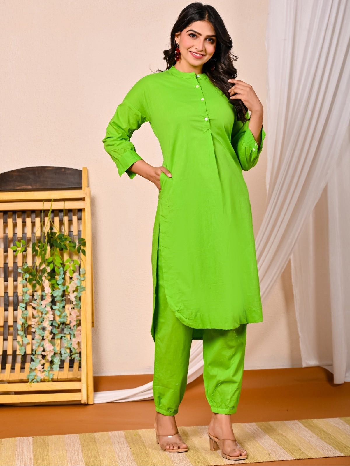 Womens Parrot Green Cotton Pathani Kurta and Pant Set