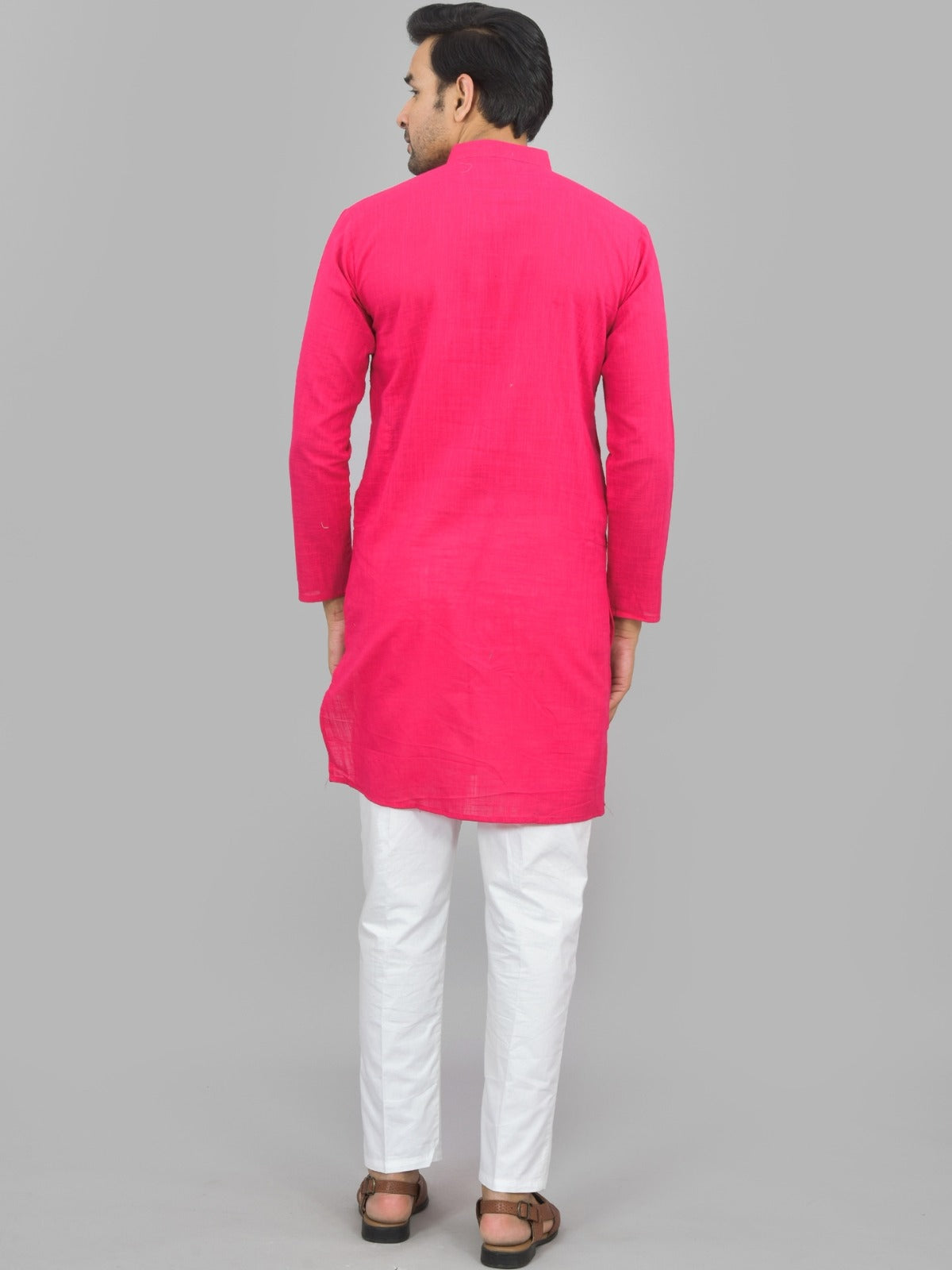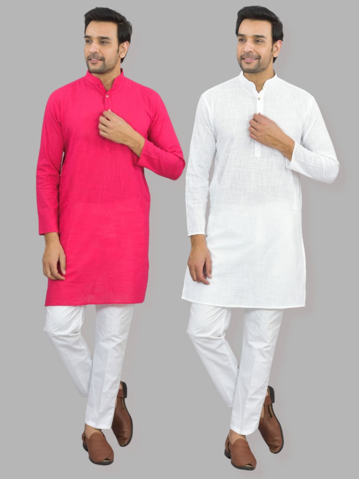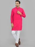 Mens Solid Rani And White Cotton Long Kurta Combo