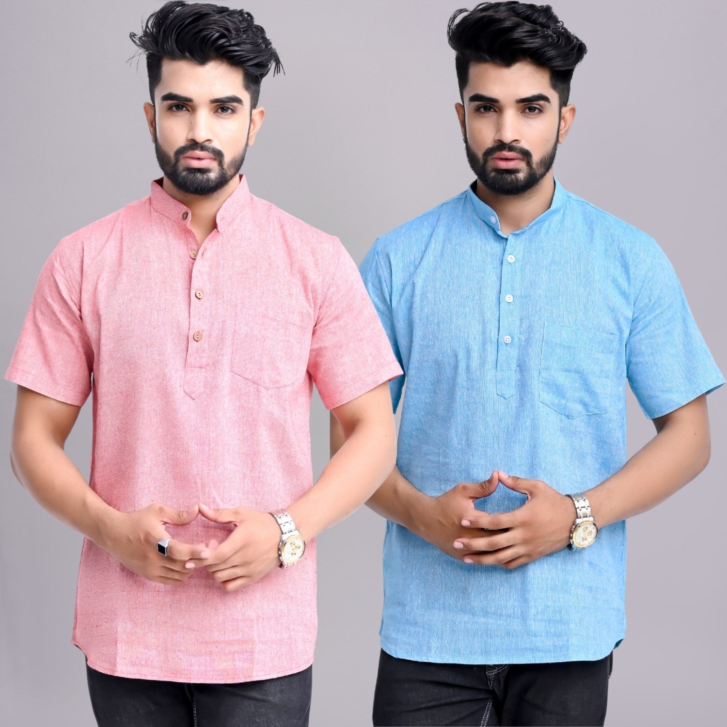 Pack of 2 Mens Solid Red And Sky Blue Khadi Cotton Short Kurta Combo