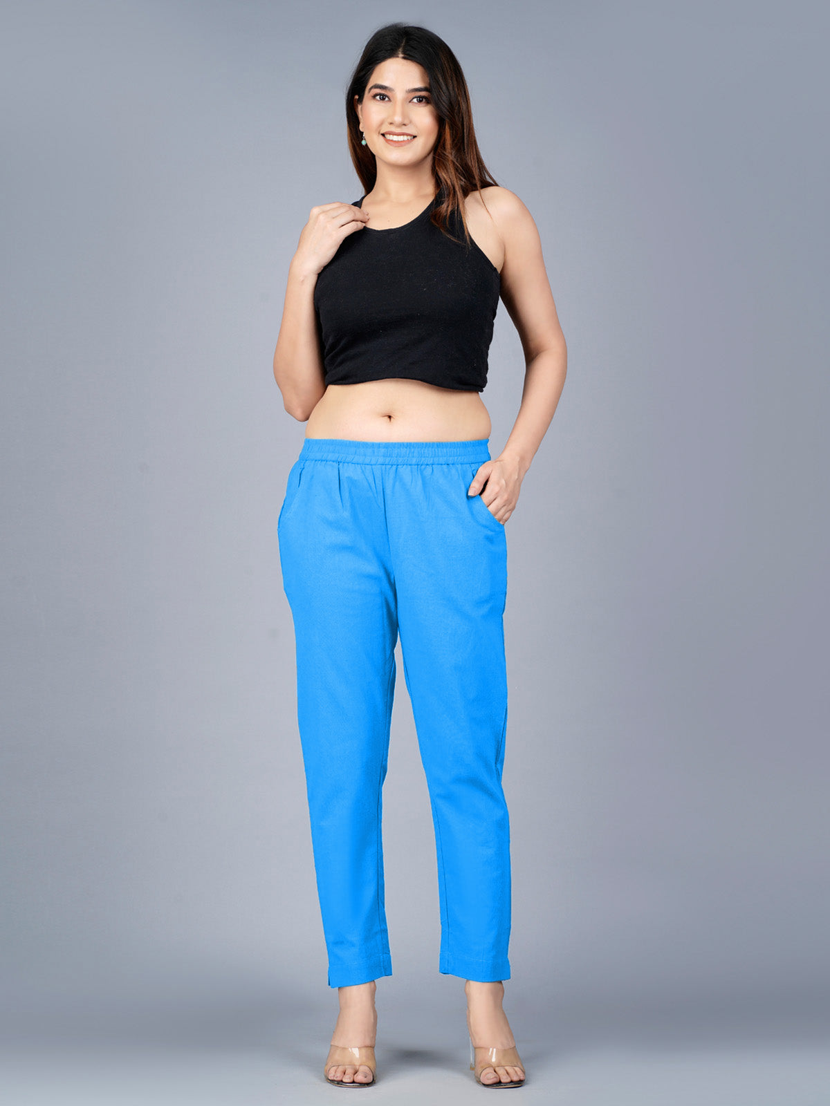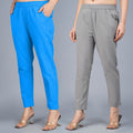 Pack Of 2 Womens Regular Fit SKy Blue And Grey Fully Elastic Waistband Cotton Trouser