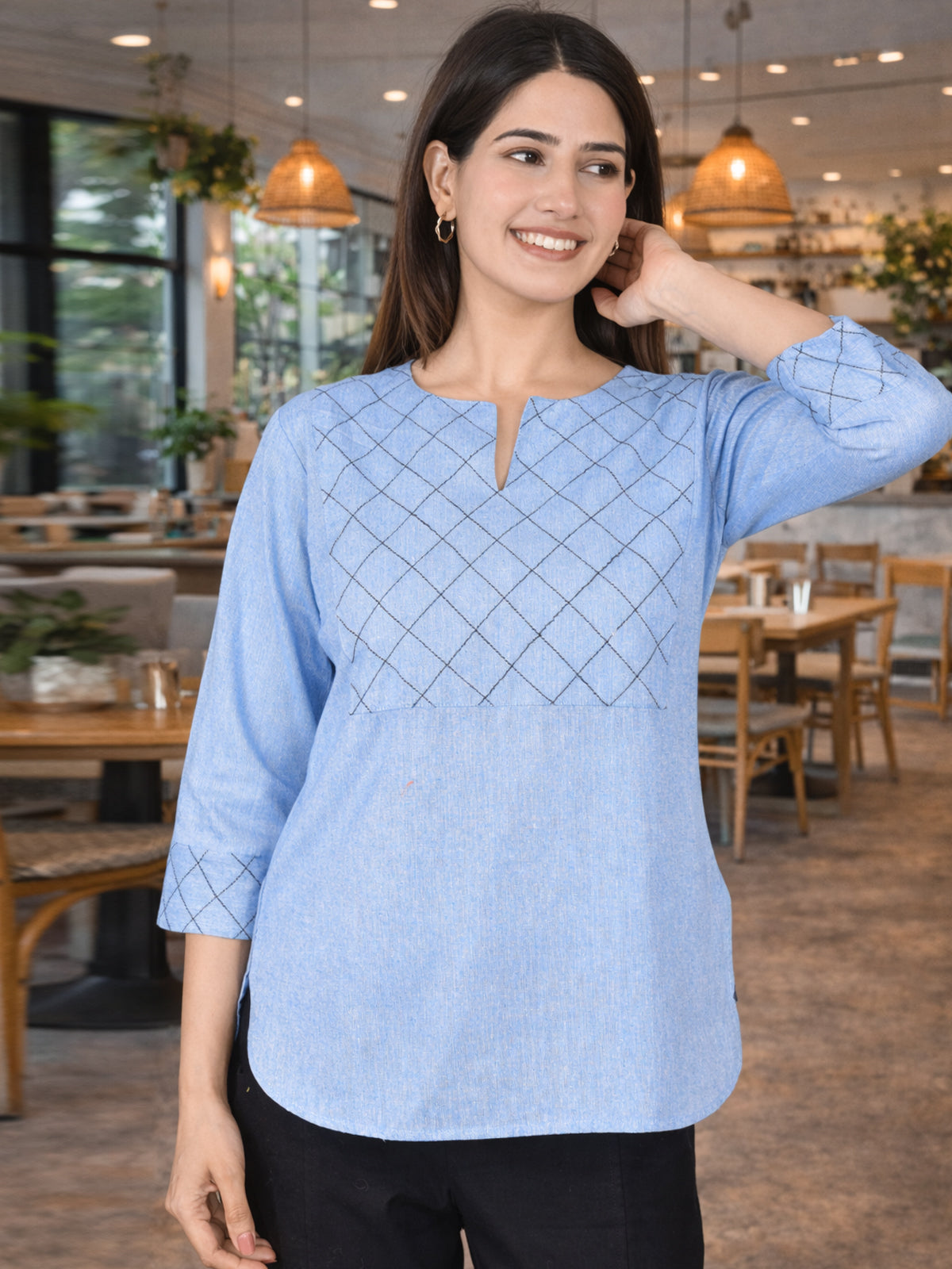Quaclo Cotton Handloom Yoke Tops for women are designed with a regular fit and made from soft, breathable handloom cotton fabric for all-day comfort and a graceful look. The elegant yoke design adds a stylish and ethnic touch, making these tops perfect for daily wear, office, or casual outings. The solid color and simple pattern make it easy to pair with jeans, leggings, or trousers for a complete and trendy outfit. Shop from a wide range of Cotton Handloom Yoke Tops from Quaclo and upgrade your everyday wardrobe with comfort and style.