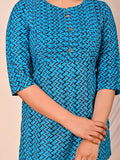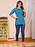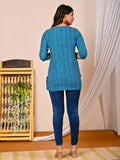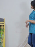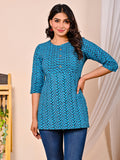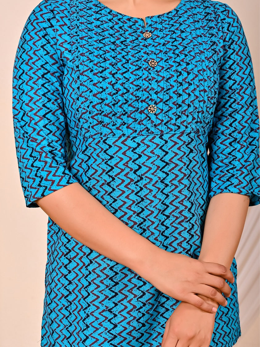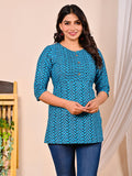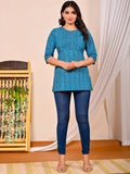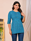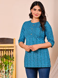Womens Teal Blue Zig-Zag Printed Short Kurti/Top