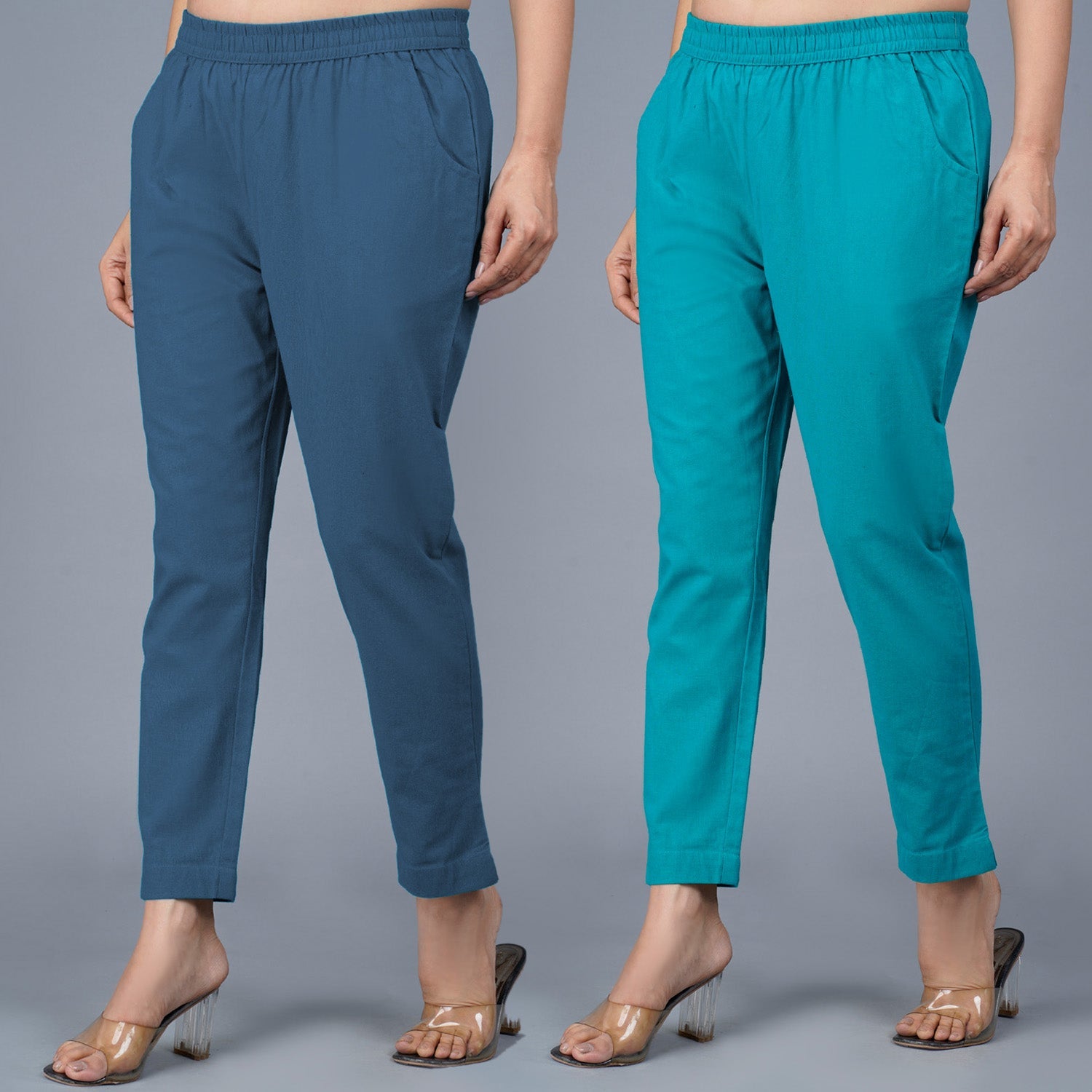 Pack Of 2 Womens Regular Fit Teal Blue And Cyan Fully Elastic Waistband Cotton Trouser