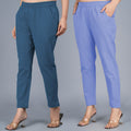Pack Of 2 Womens Regular Fit Teal Blue And Denim Blue Fully Elastic Waistband Cotton Trouser