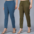 Pack Of 2 Womens Regular Fit Teal Blue And Dark Green Fully Elastic Waistband Cotton Trouser