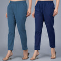 Pack Of 2 Womens Regular Fit Teal Blue And Navy Blue Fully Elastic Waistband Cotton Trouser
