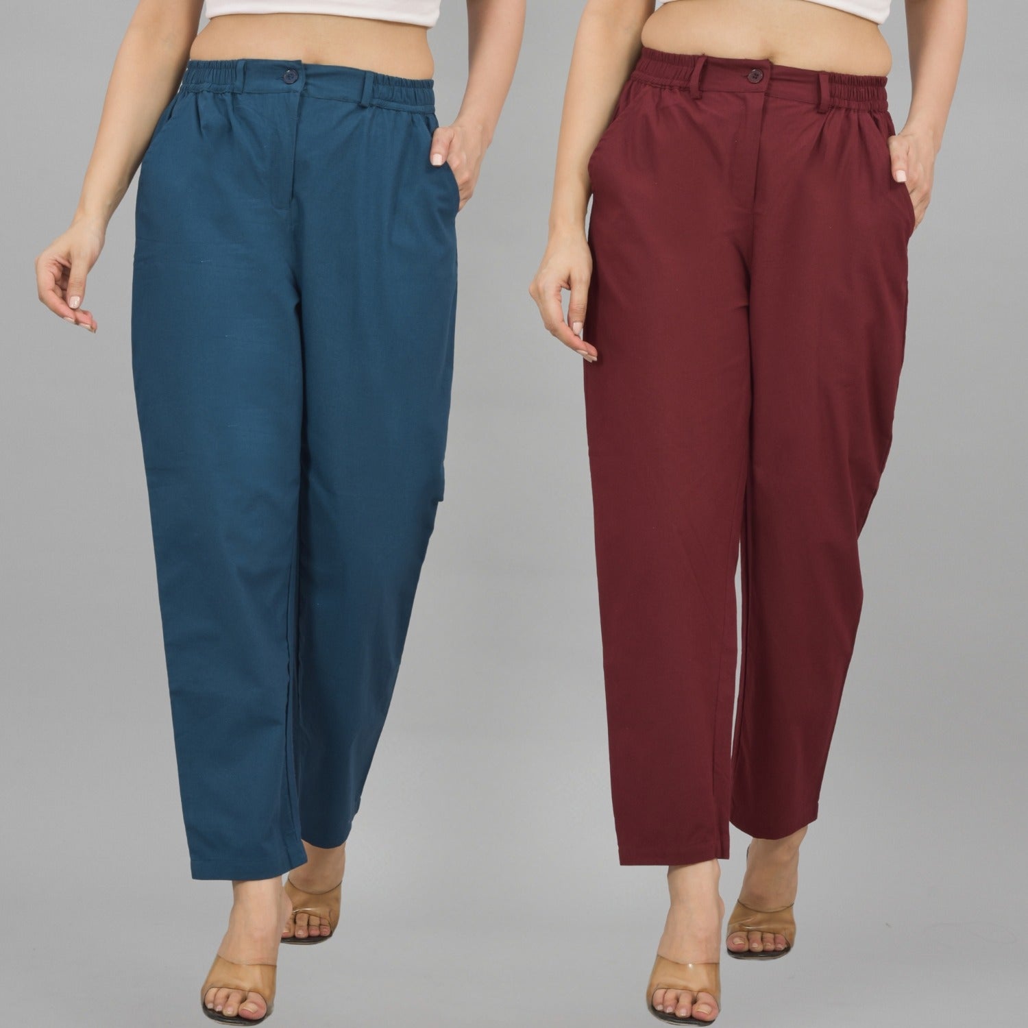 Combo Pack Of 2 Teal Blue And Wine Womens Cotton Formal Pants