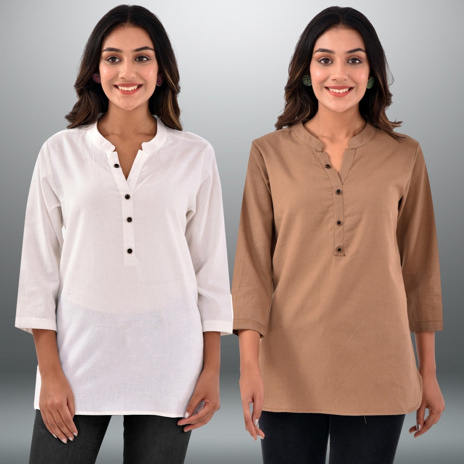 This Pack Of 2 Women's Solid Top Combo, is the ideal fusion of comfort and design, These will upgrade your wardrobe, made from a high-quality cotton that keeps you comfortable all day. Your outfit is made more sophisticated by the tasteful design. These adaptable tops is the perfect pick whether you're going to the office, on a casual trip, or to a weekend brunch. It radiates classic appeal and ups your fashion game, complete with a chinese/mandarin collar. The Women's Solid Top Combo can help you achieve modern elegance right away.