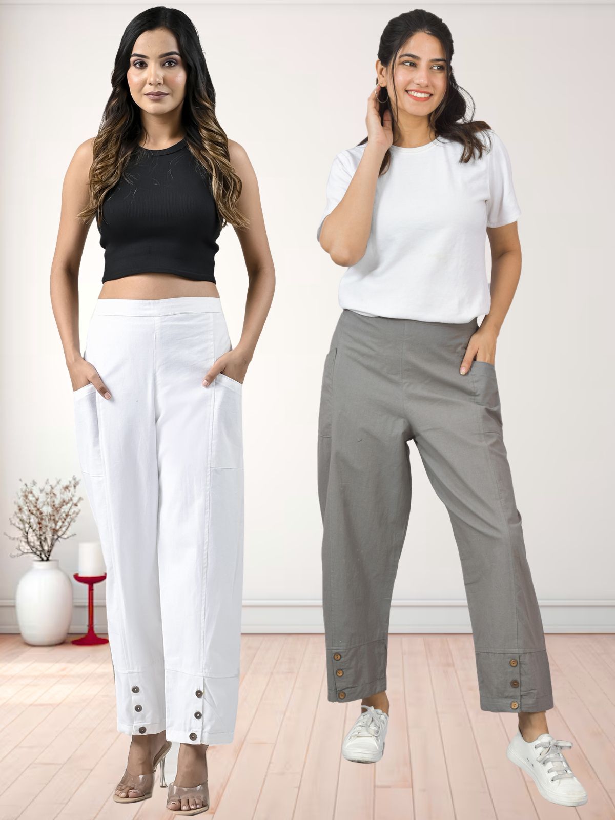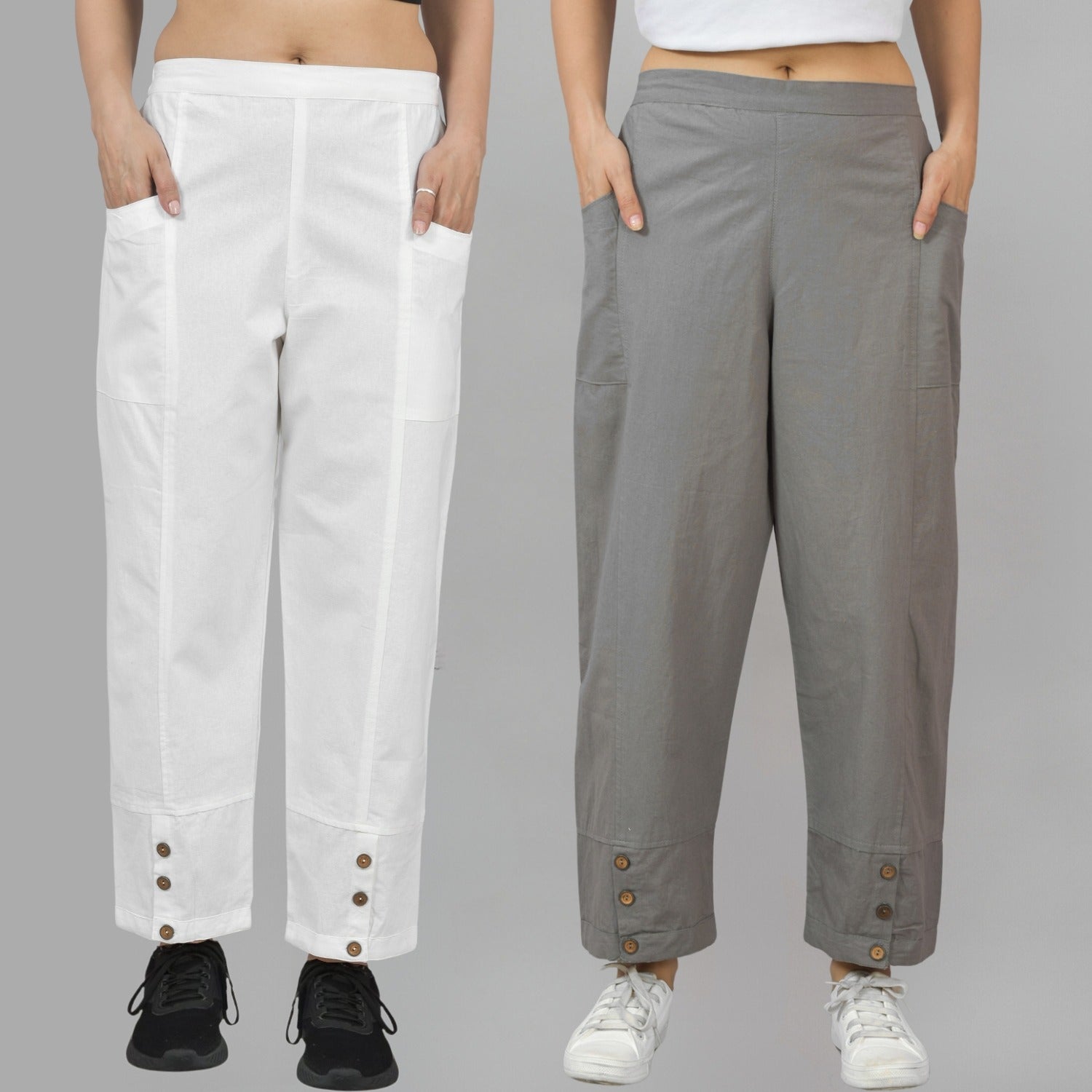 Combo Pack Of Womens White And Grey Side Pocket Straight Cargo Pants