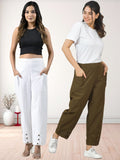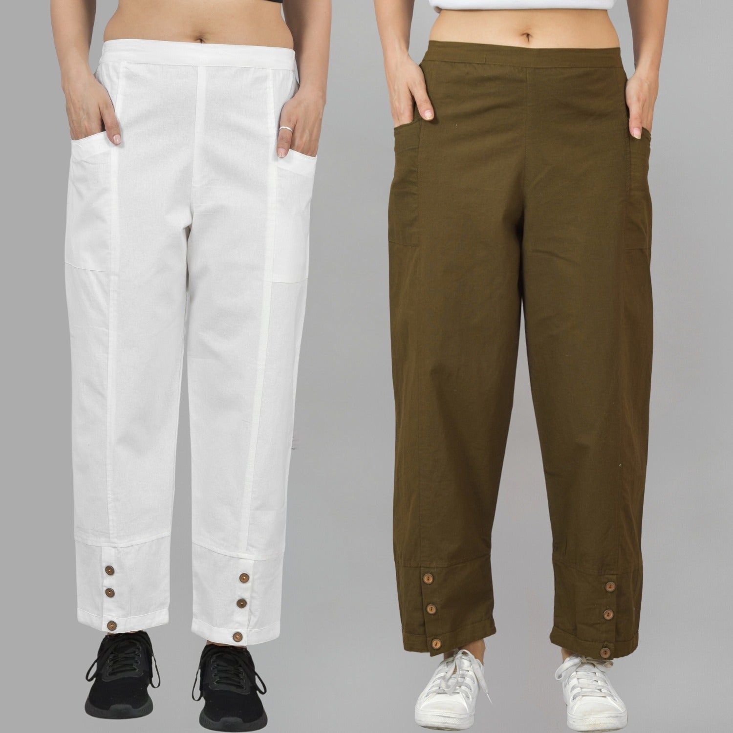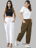 Combo Pack Of Womens White And Mehendi Green Side Pocket Straight Cargo Pants
