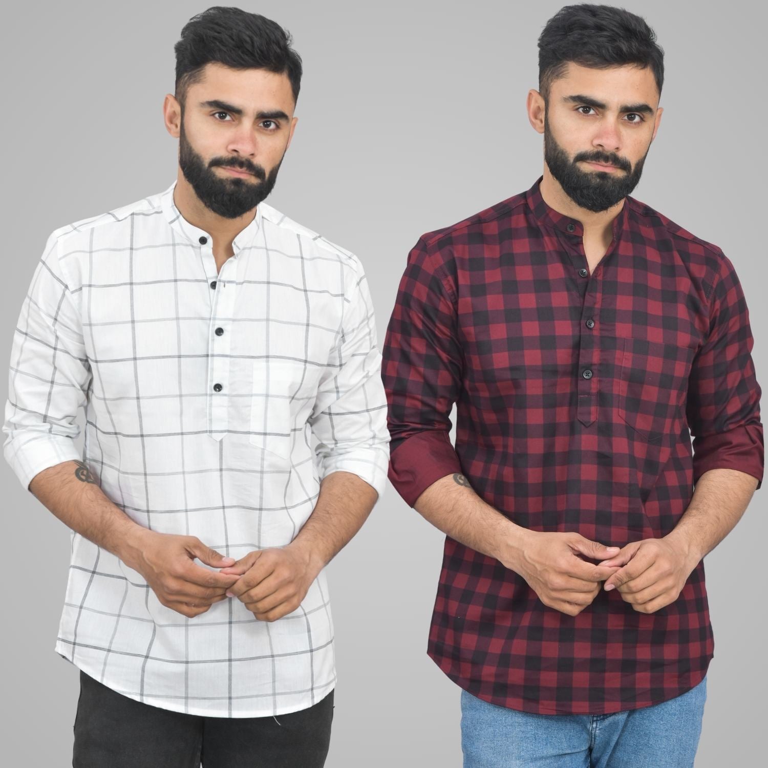 Pack Of 2 Mens White Wide And Wine Check Cotton Short Kurta Combo