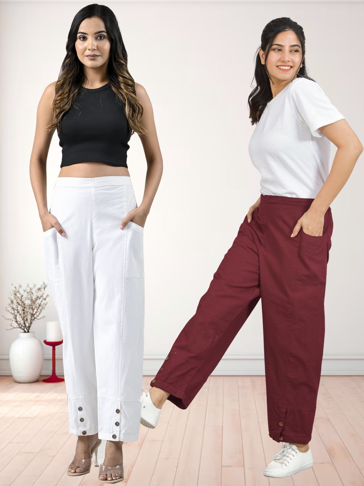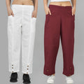 Combo Pack Of Womens White And Wine Side Pocket Straight Cargo Pants