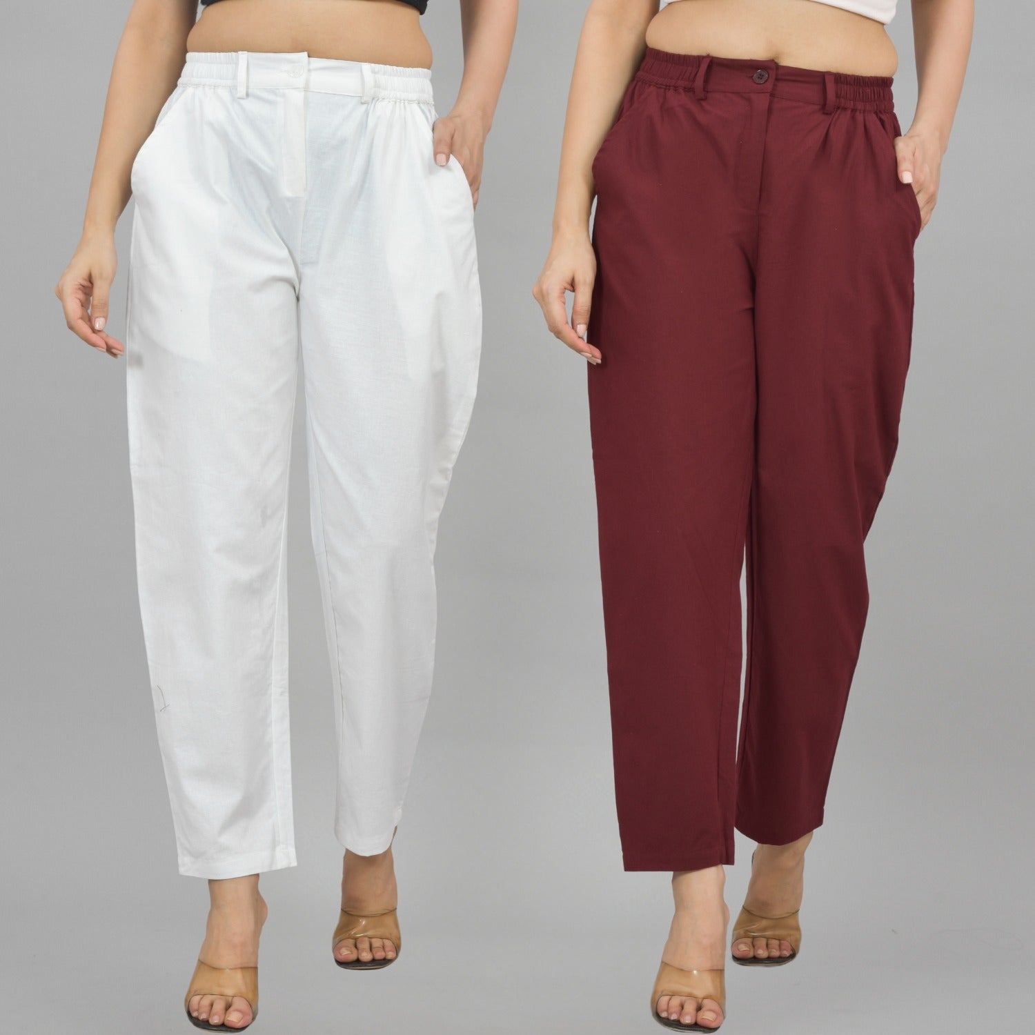 Combo Pack Of 2 White And Wine Womens Cotton Formal Pants