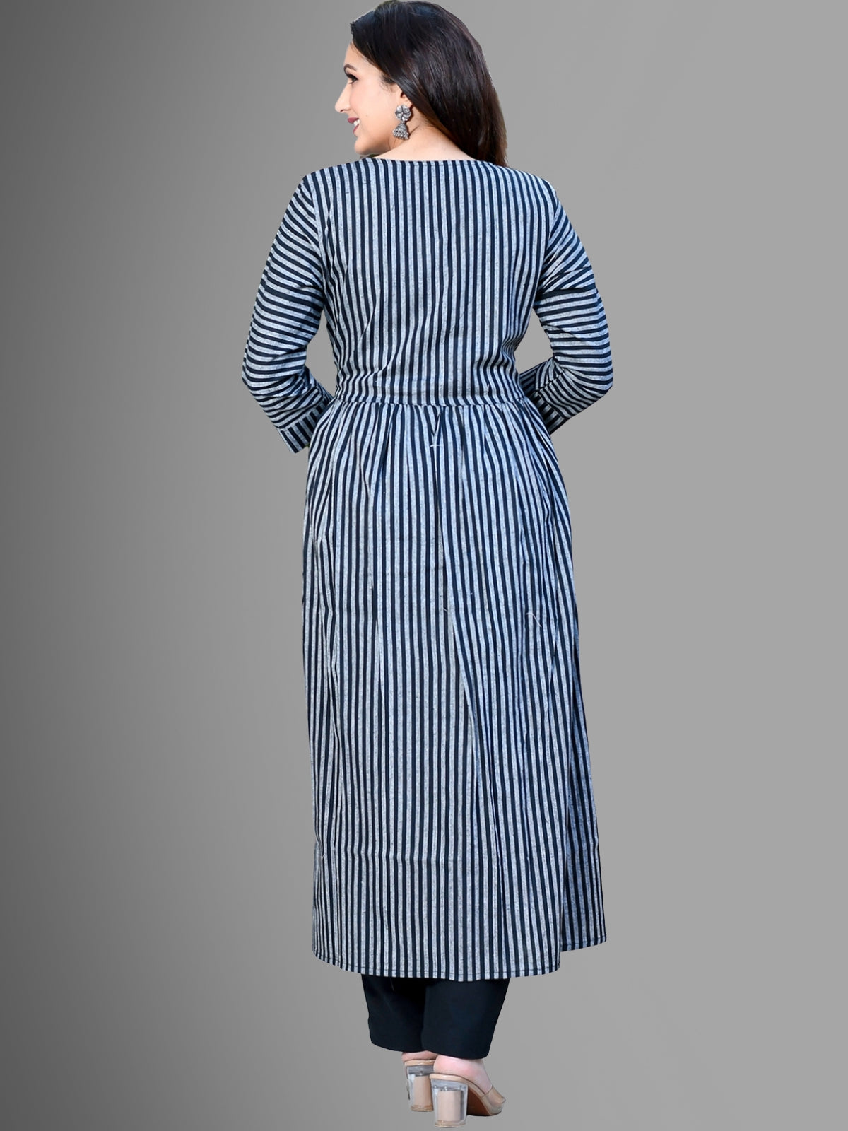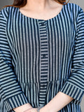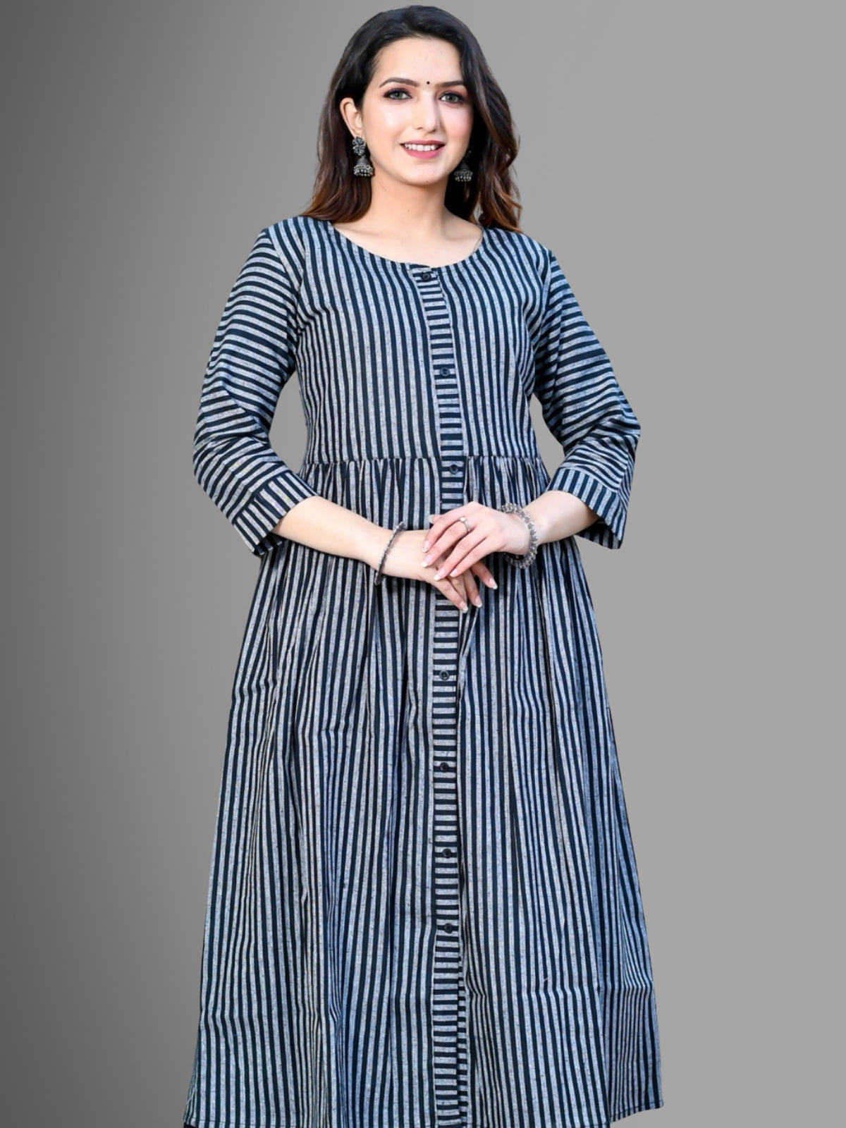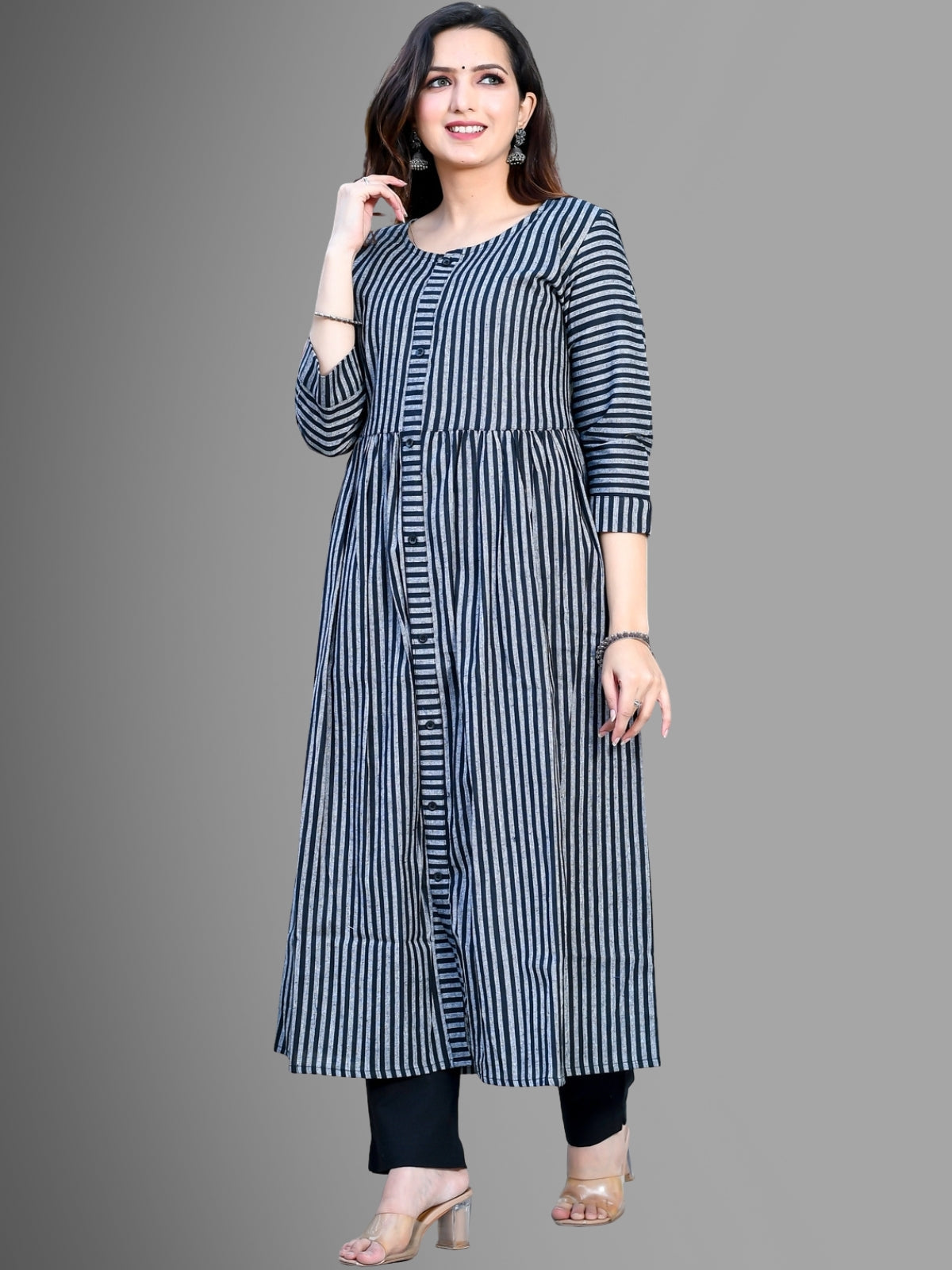 This Handloom Women Striped South Cotton Flared Kurta. Fashionable Women Formal Kurta With stylish Round Neck and pure south cotton fabric for a perfect look.