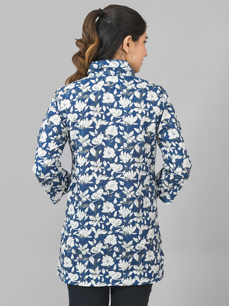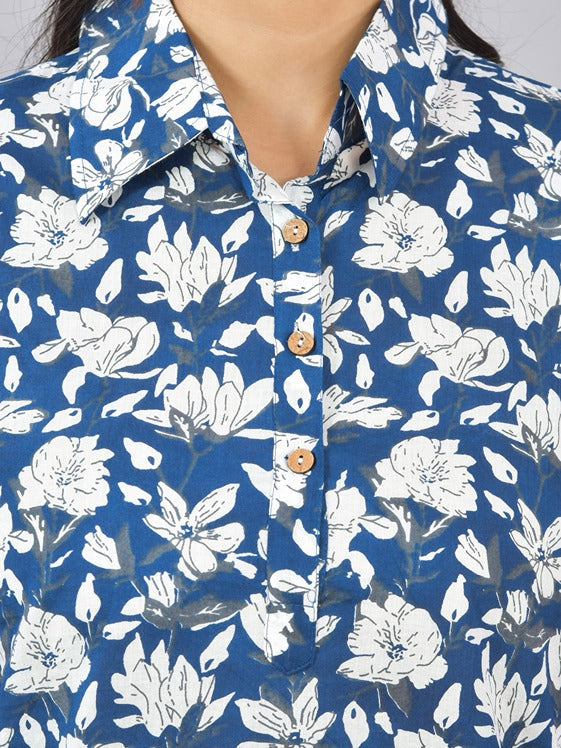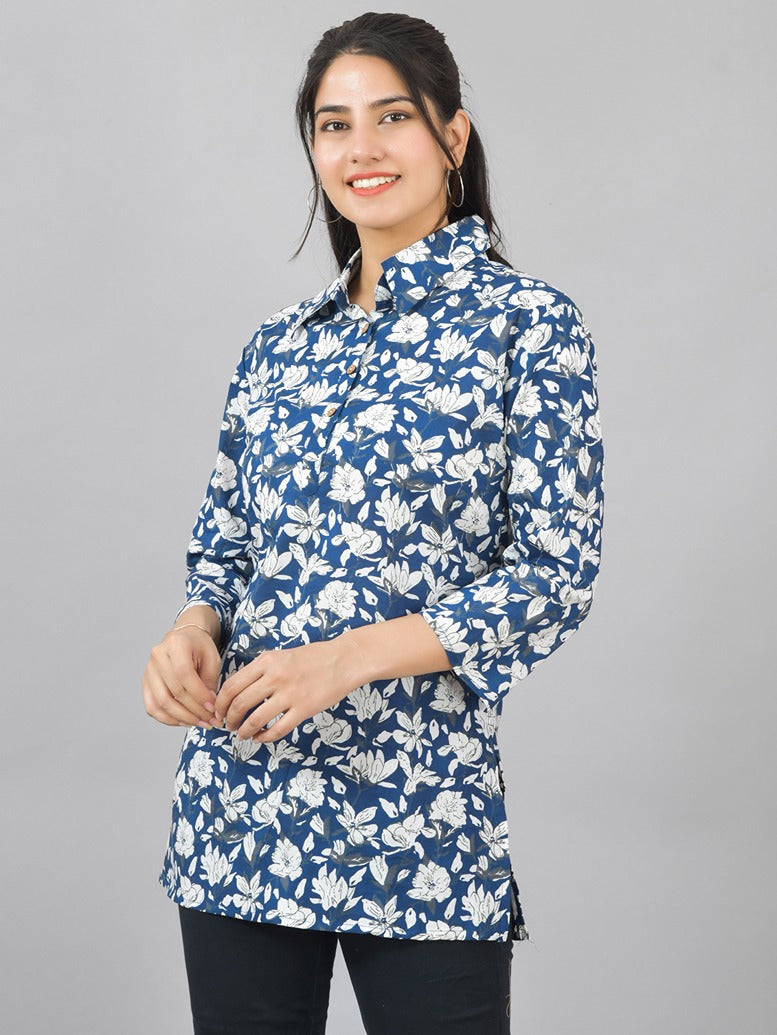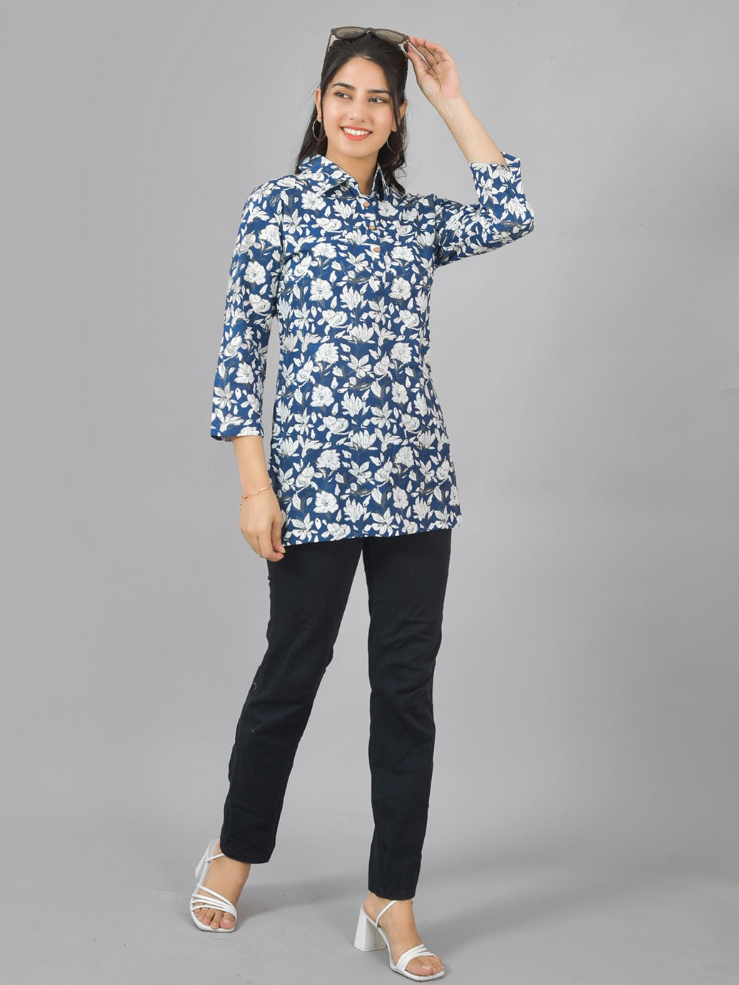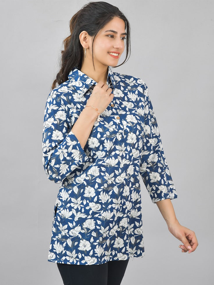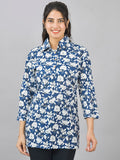 Women Blue Floral Printed Cotton Spread Collar Short Kurti