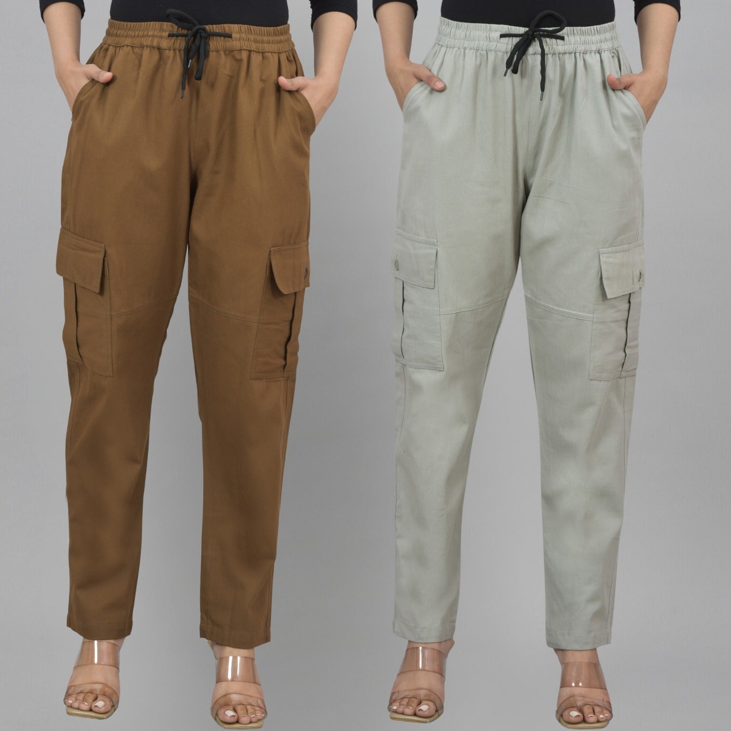 Pack Of 2 Womens Brown And Melange Grey 5 Pocket Twill Straight Cargo Pants
