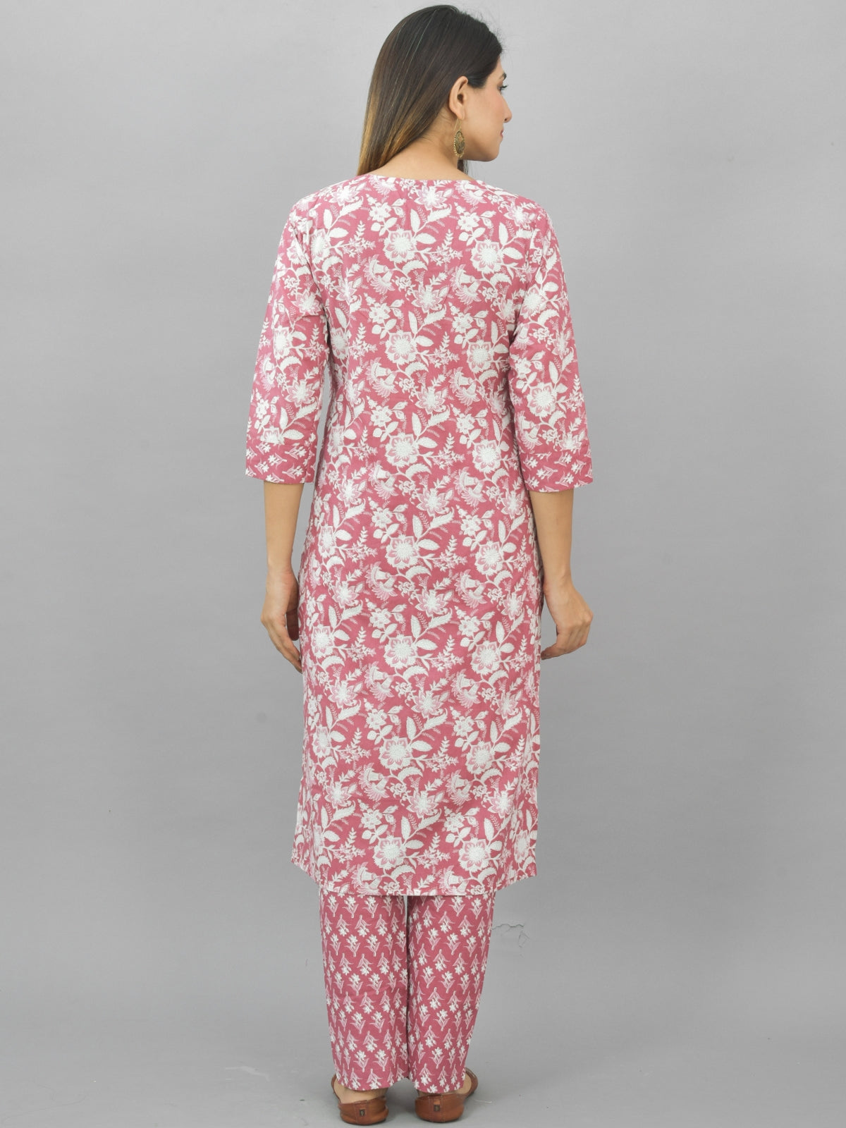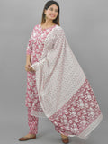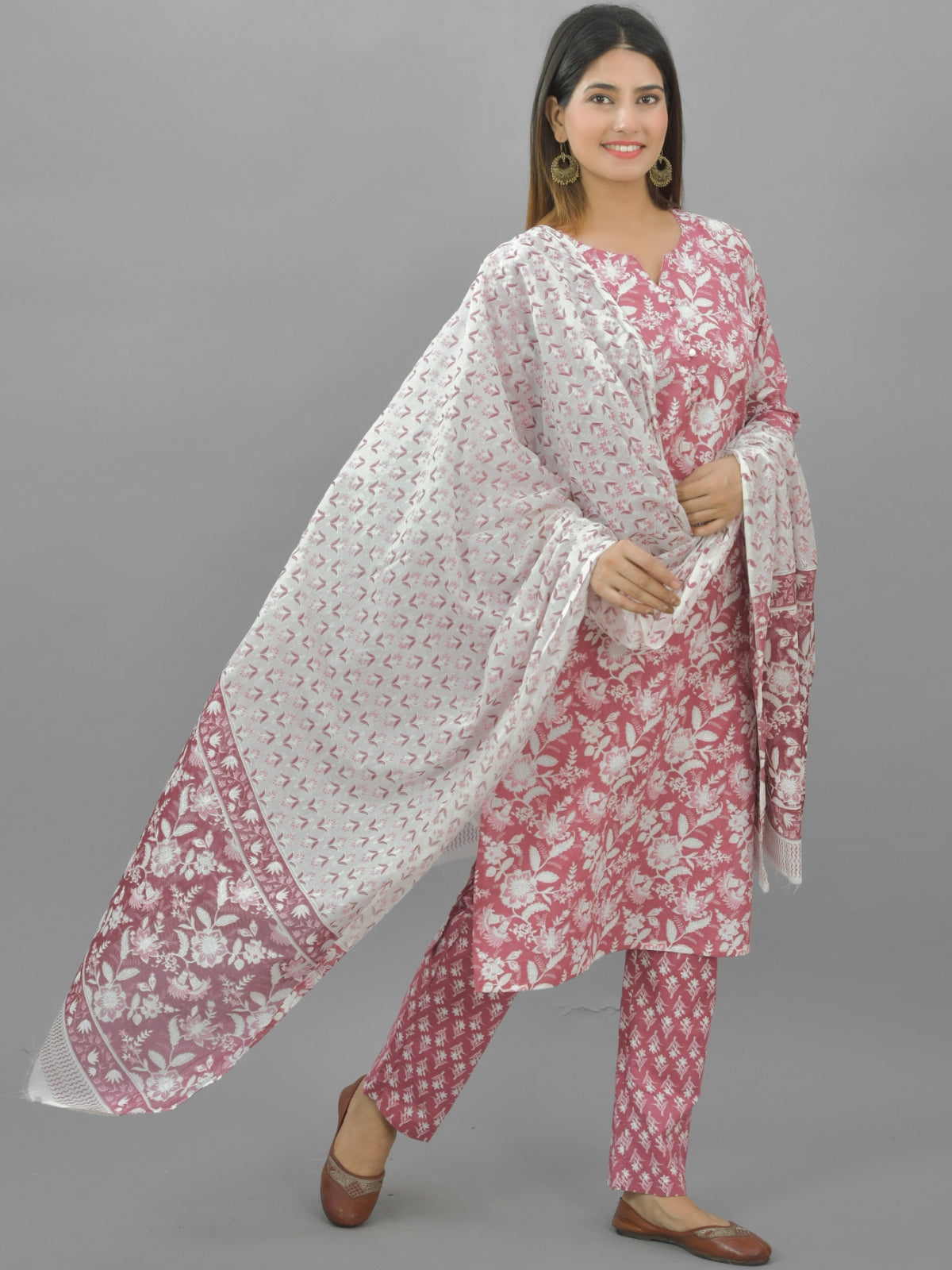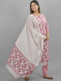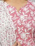 Womens Flower Printed Coral Pink Kurti, Dupatta And Pant Set