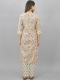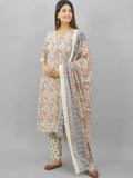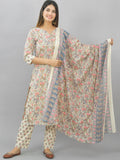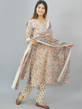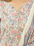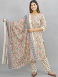 Womens Flower Printed Cream Kurti, Dupatta And Pant Set
