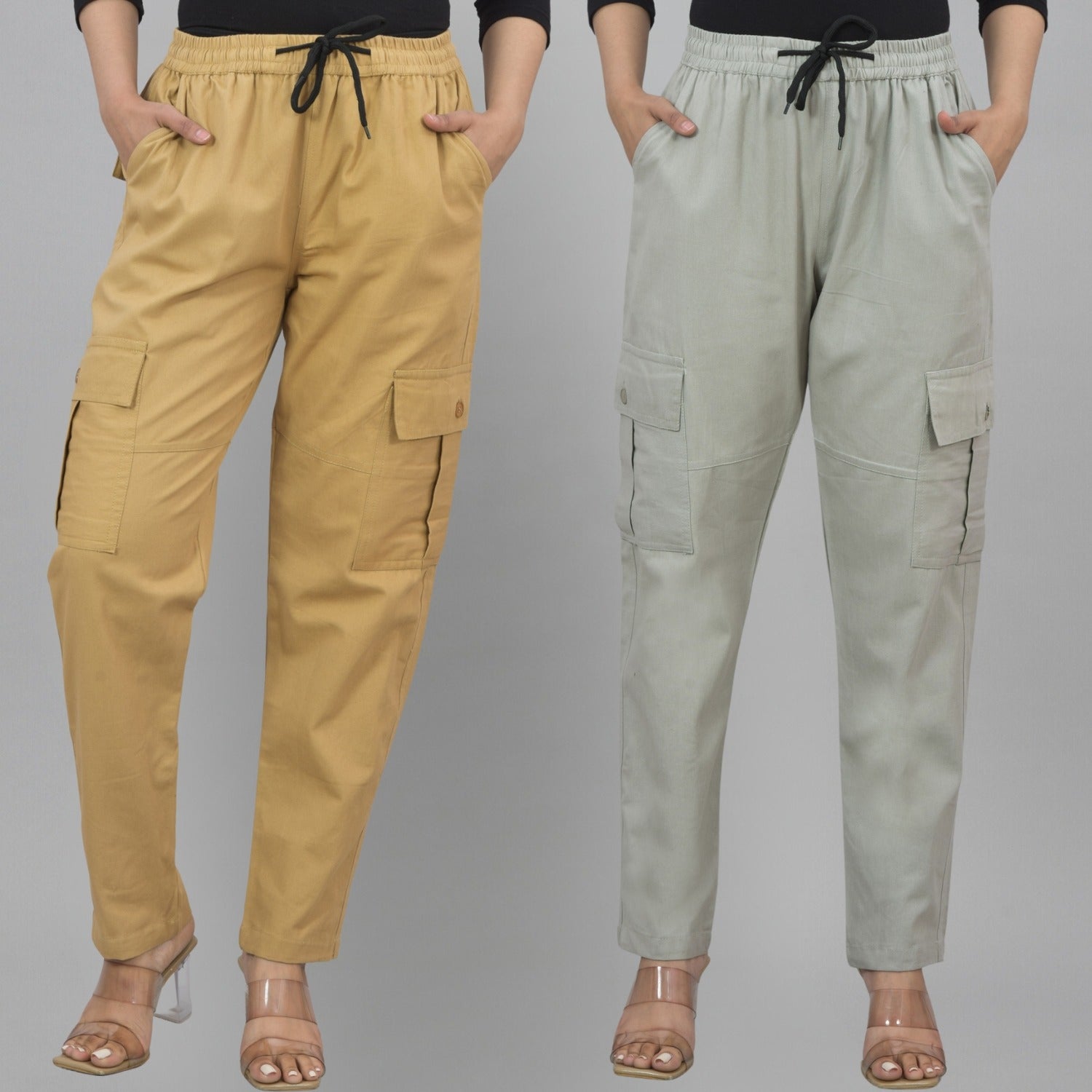 Pack Of 2 Womens Khaki And Melange Grey 5 Pocket Twill Straight Cargo Pants