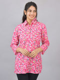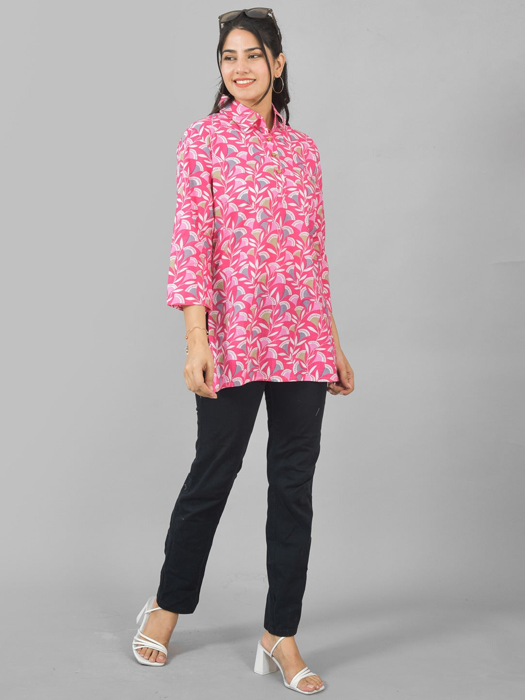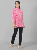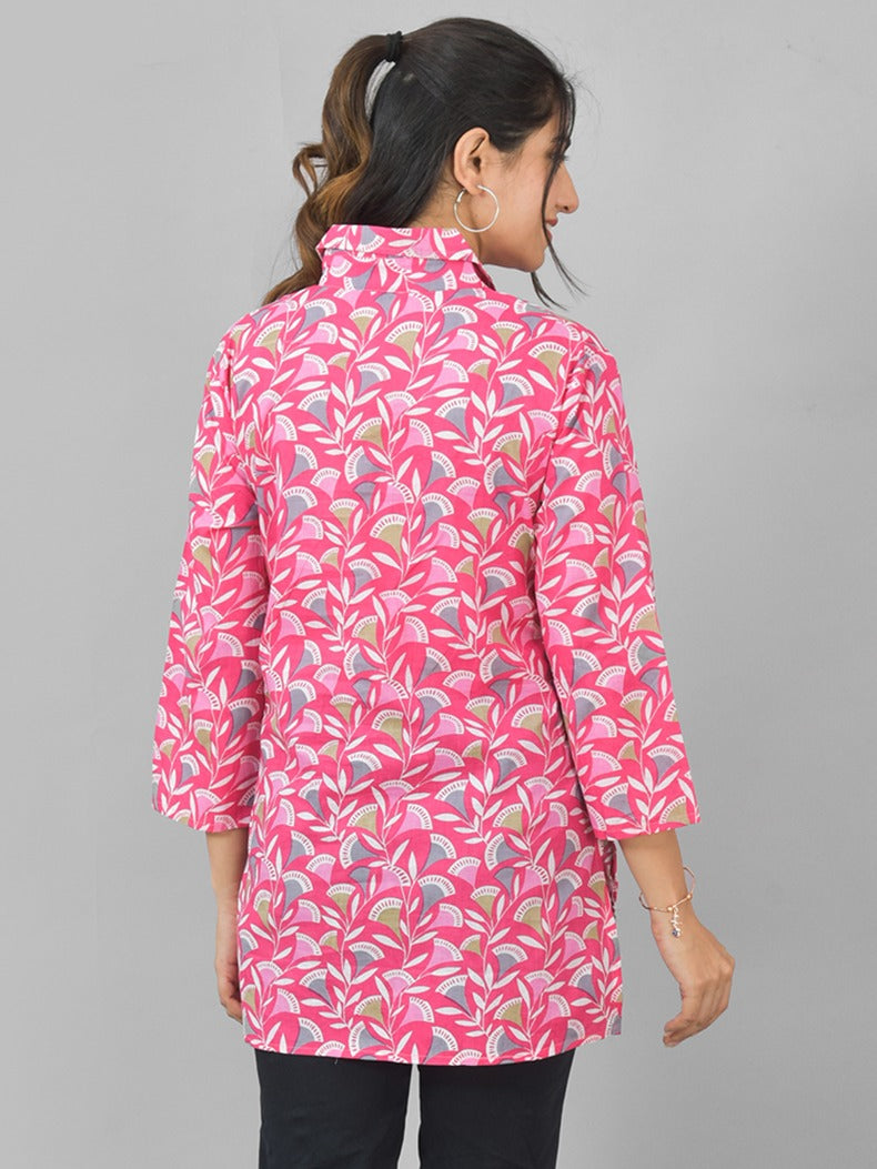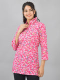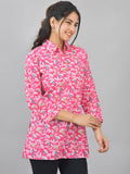 Women Pink Floral Printed Cotton Spread Collar Short Kurti