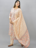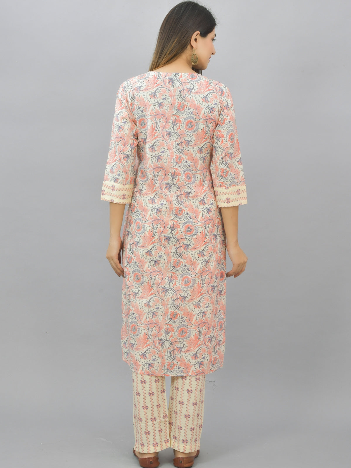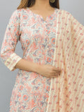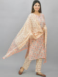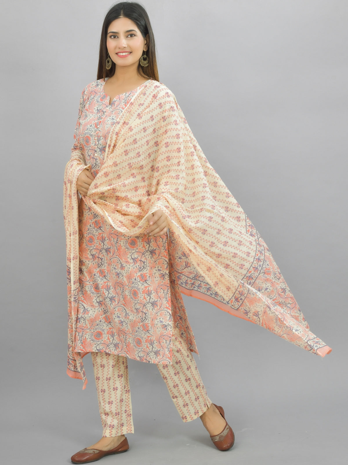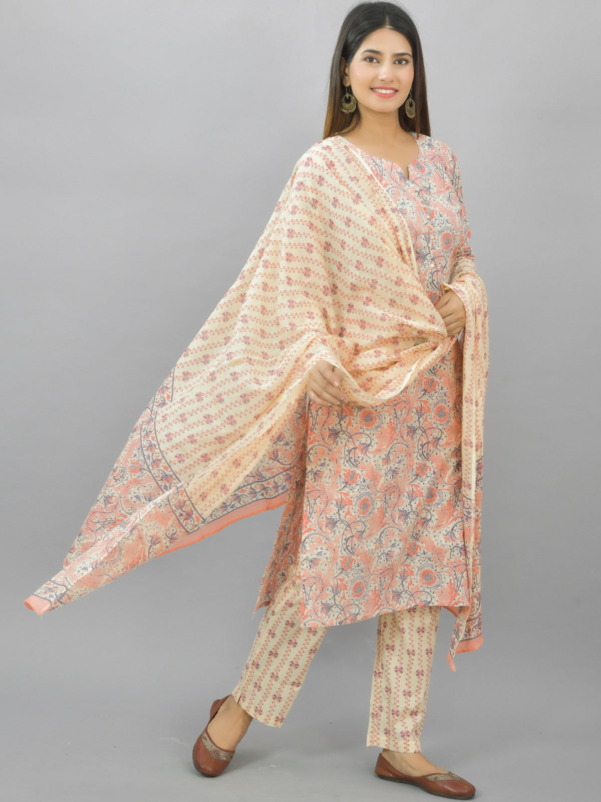 Womens Flower Printed Coral Pink Kurti, Dupatta And Pant Set