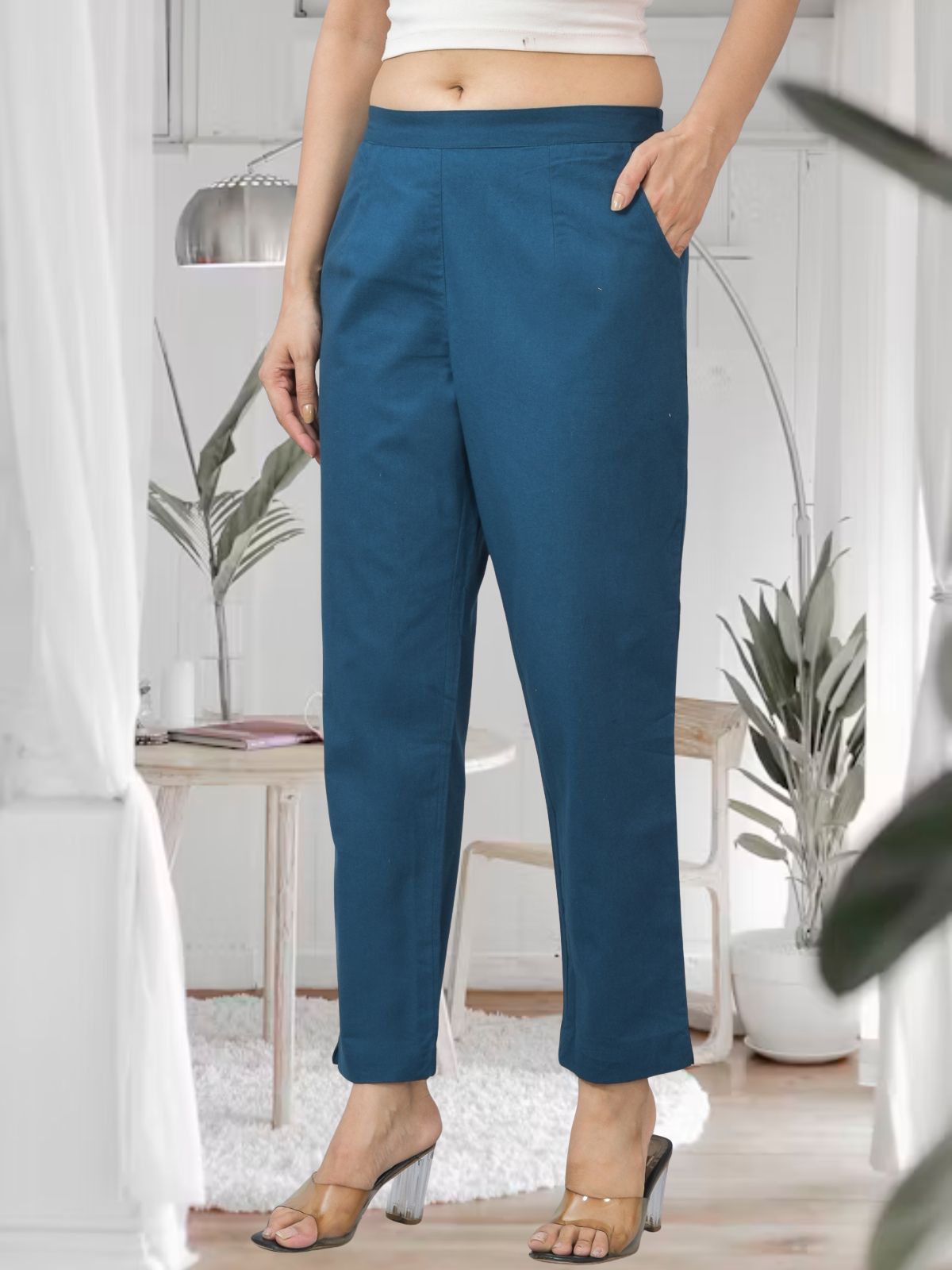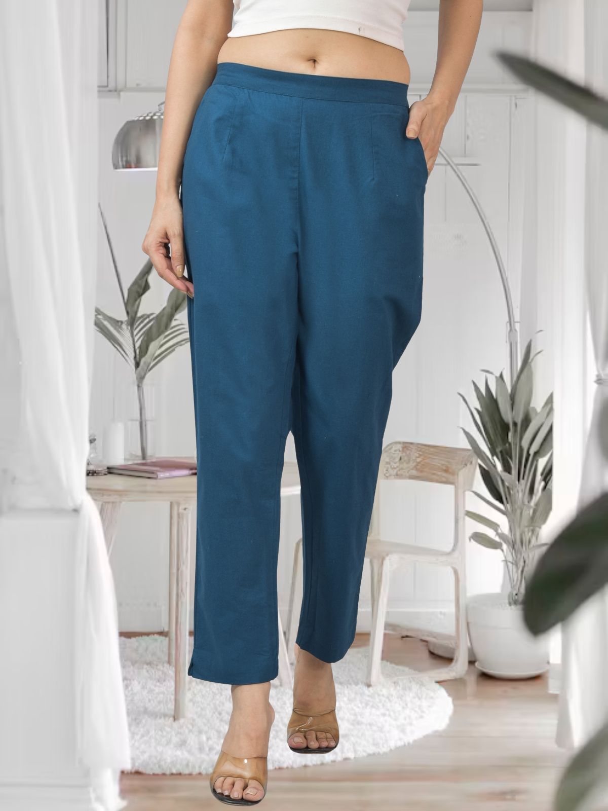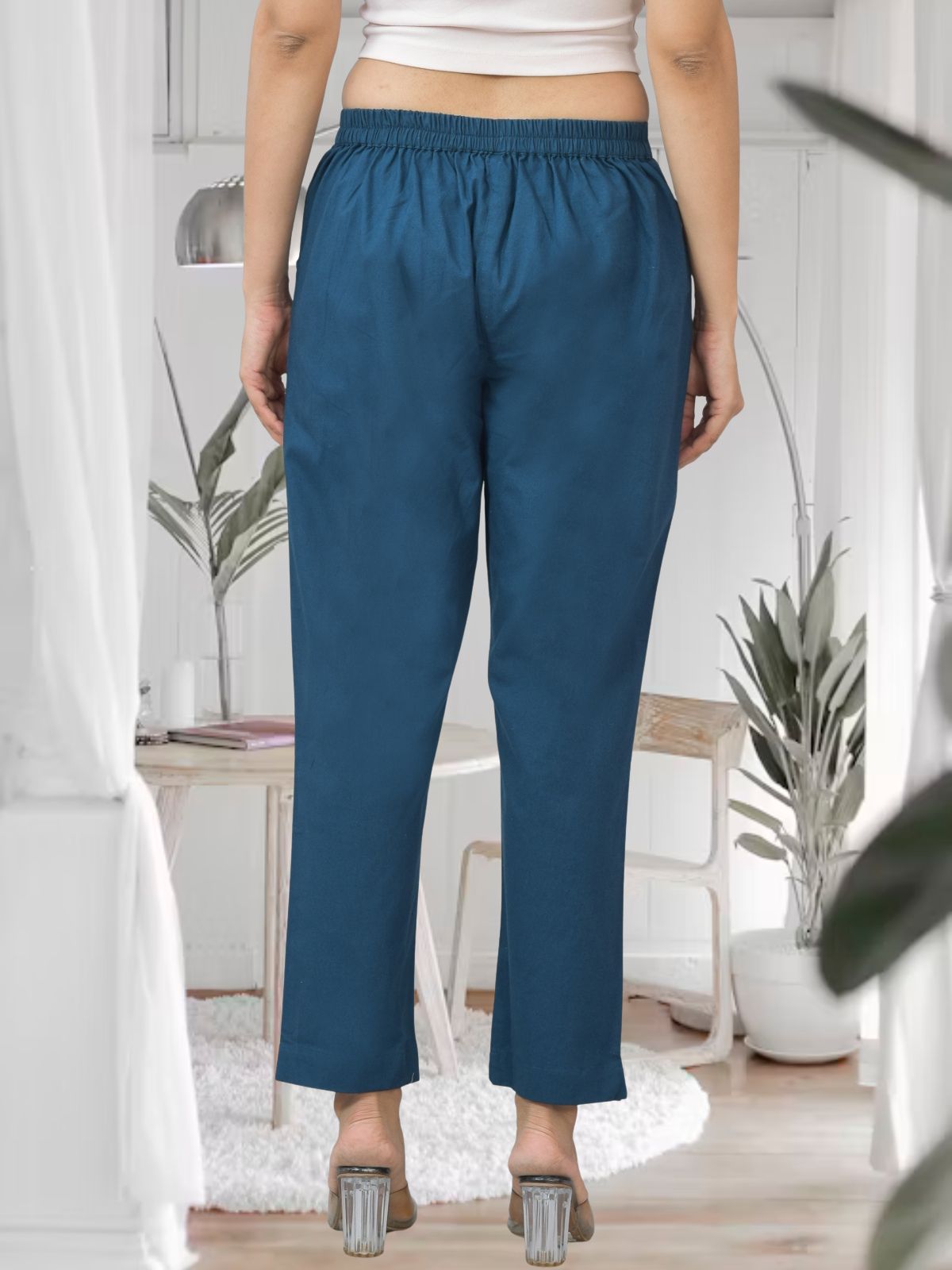 These Quaclo Womens Deep Two Pocket Solid Cotton Trousers is functional and fashionable addition to your daily outfit. These trousers, which are made from cotton, provide unmatched comfort and breathability for all-day wear. The half elastic waistband closure ensures a perfect fit and easy on-and-off, making these trousers a go-to choice for comfort and convenience. These trousers are ideal for business, casual outings, or special occasions thanks to their classic style and flawless fit. The two spacious pockets improve functionality and convenience for your daily activities, and the solid design makes these trousers a long-lasting classic in your wardrobe. With the Quaclo Womens Deep Two Pocket Cotton Trousers, where comfort and style easily converge, up your fashion game.
