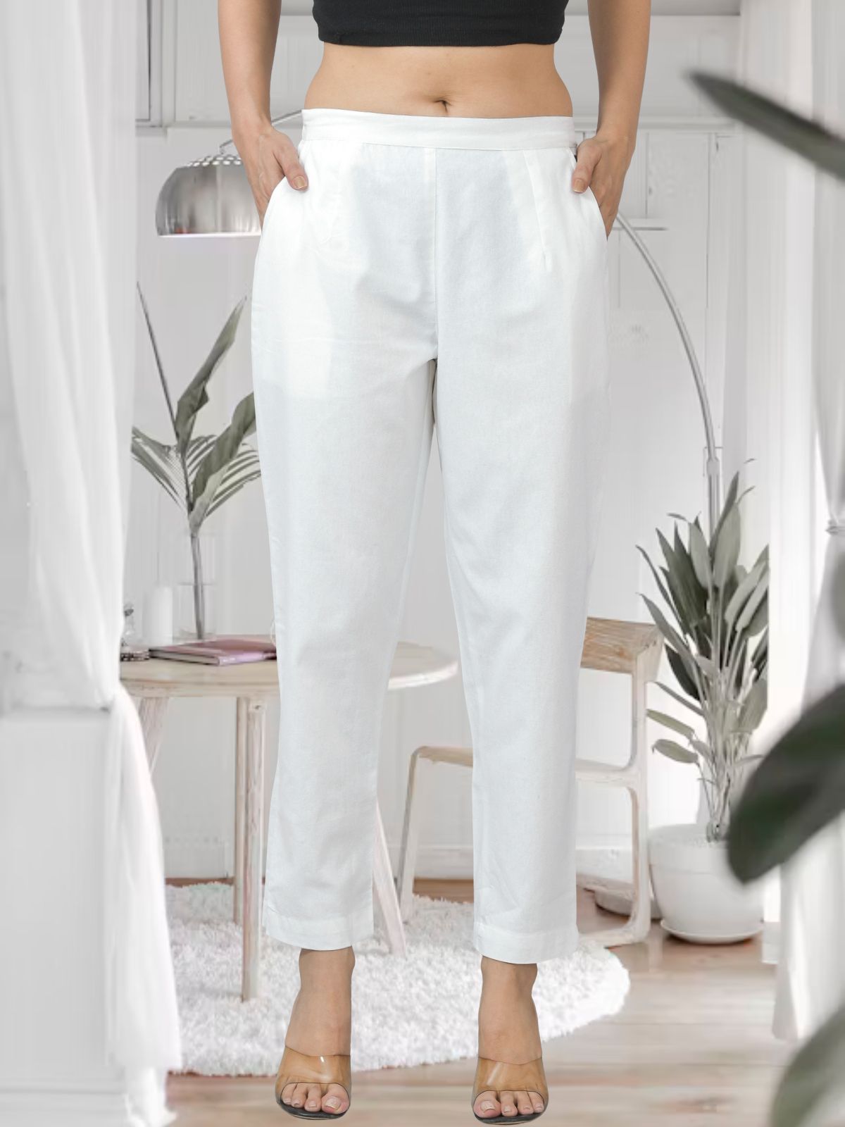 White Half Elastic Airy Linen Cotton Pants