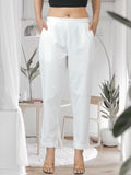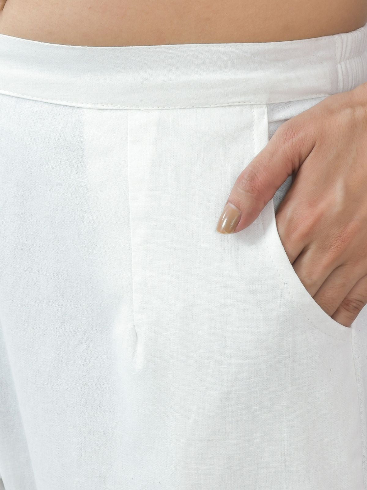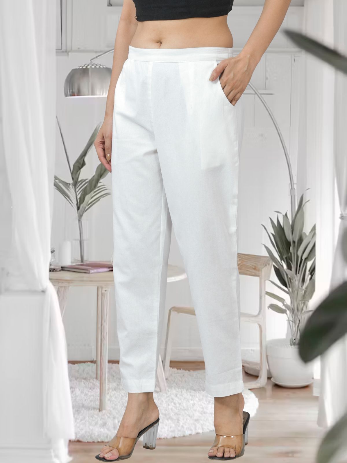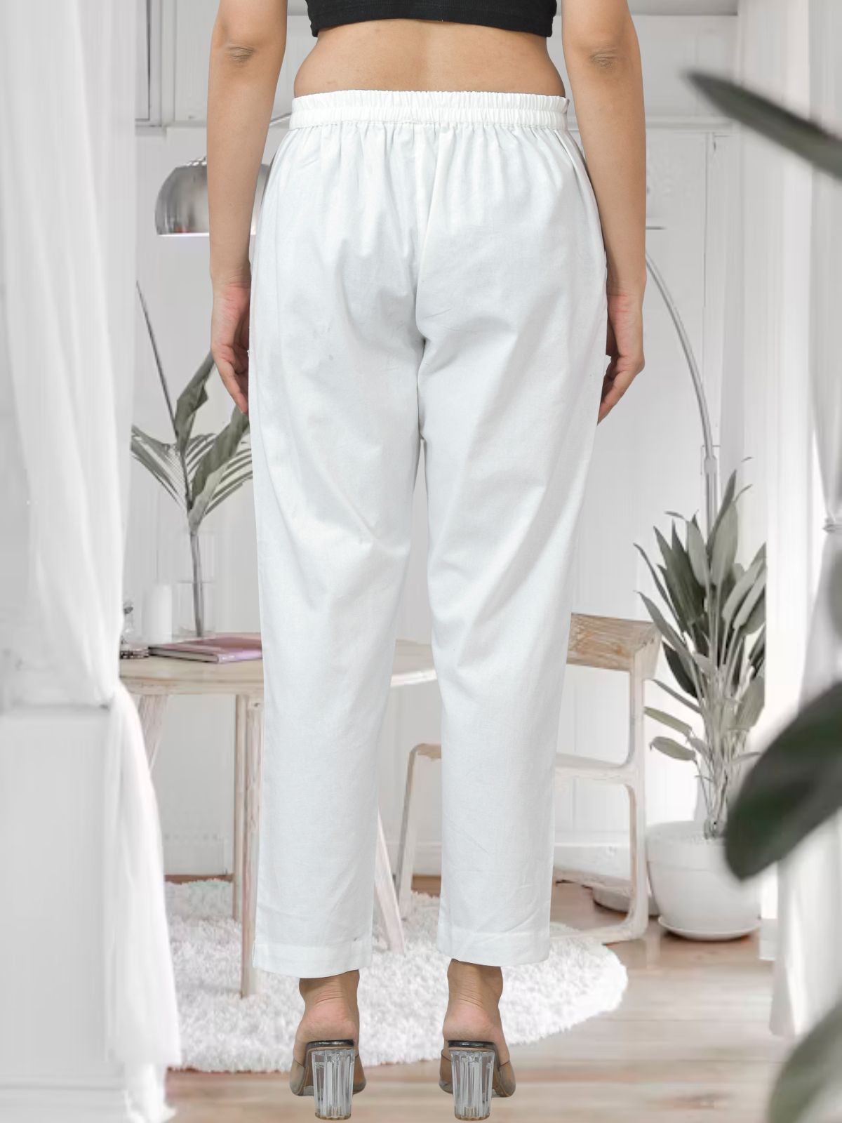 These Quaclo Womens Deep Two Pocket Solid Cotton Trousers is functional and fashionable addition to your daily outfit. These trousers, which are made from cotton, provide unmatched comfort and breathability for all-day wear. The half elastic waistband closure ensures a perfect fit and easy on-and-off, making these trousers a go-to choice for comfort and convenience. These trousers are ideal for business, casual outings, or special occasions thanks to their classic style and flawless fit. The two spacious pockets improve functionality and convenience for your daily activities, and the solid design makes these trousers a long-lasting classic in your wardrobe. With the Quaclo Womens Deep Two Pocket Cotton Trousers, where comfort and style easily converge, up your fashion game.