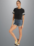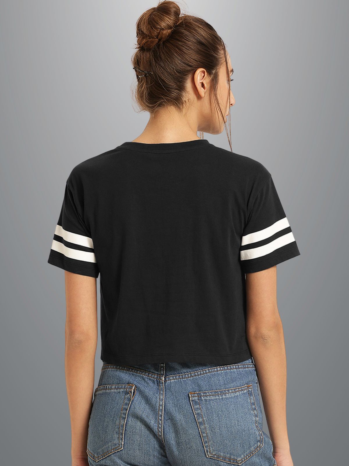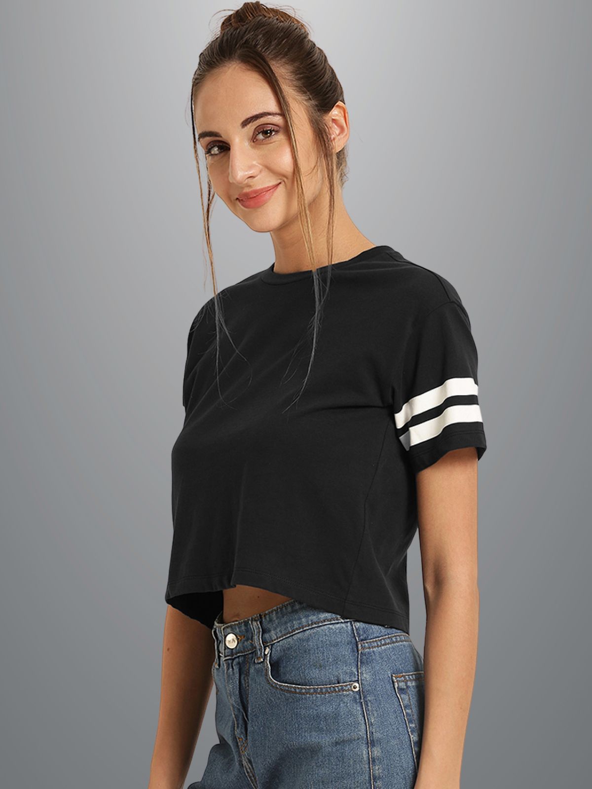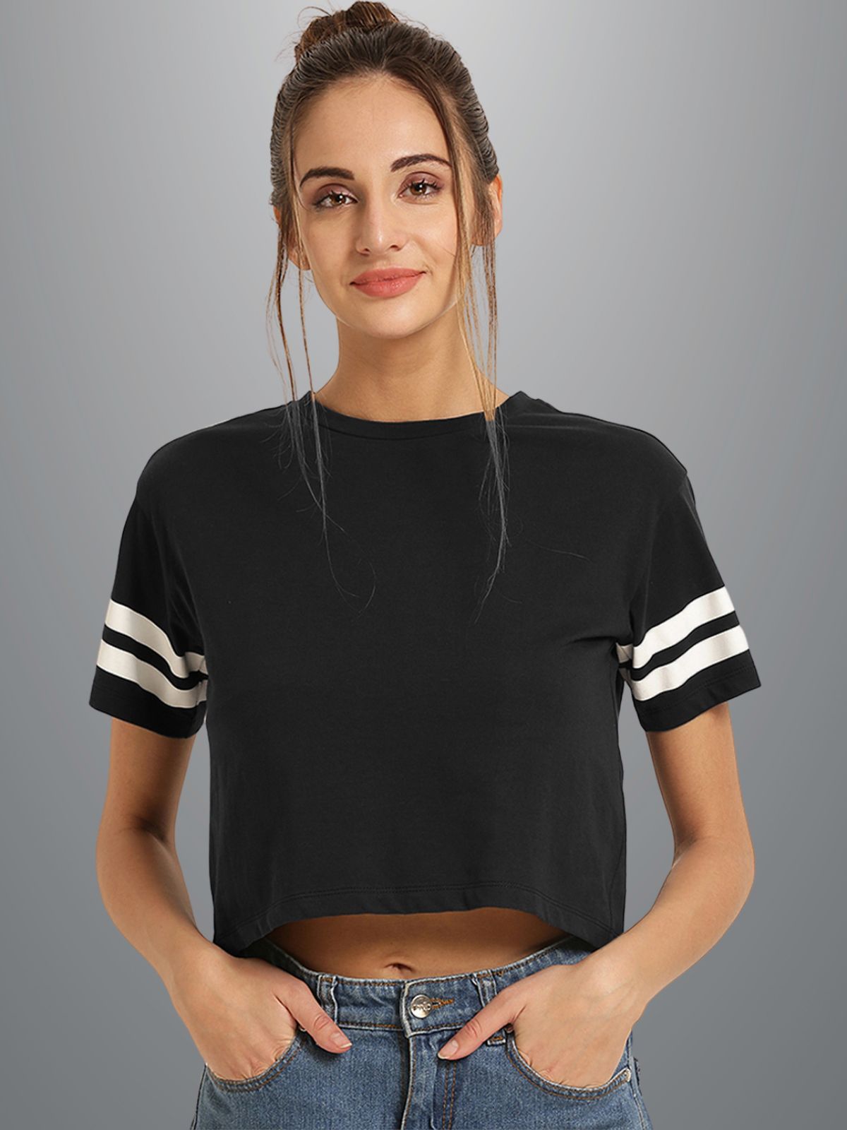 Womens Solid Black Cotton Crop Top With Designer White Stripe