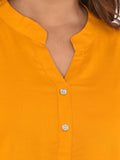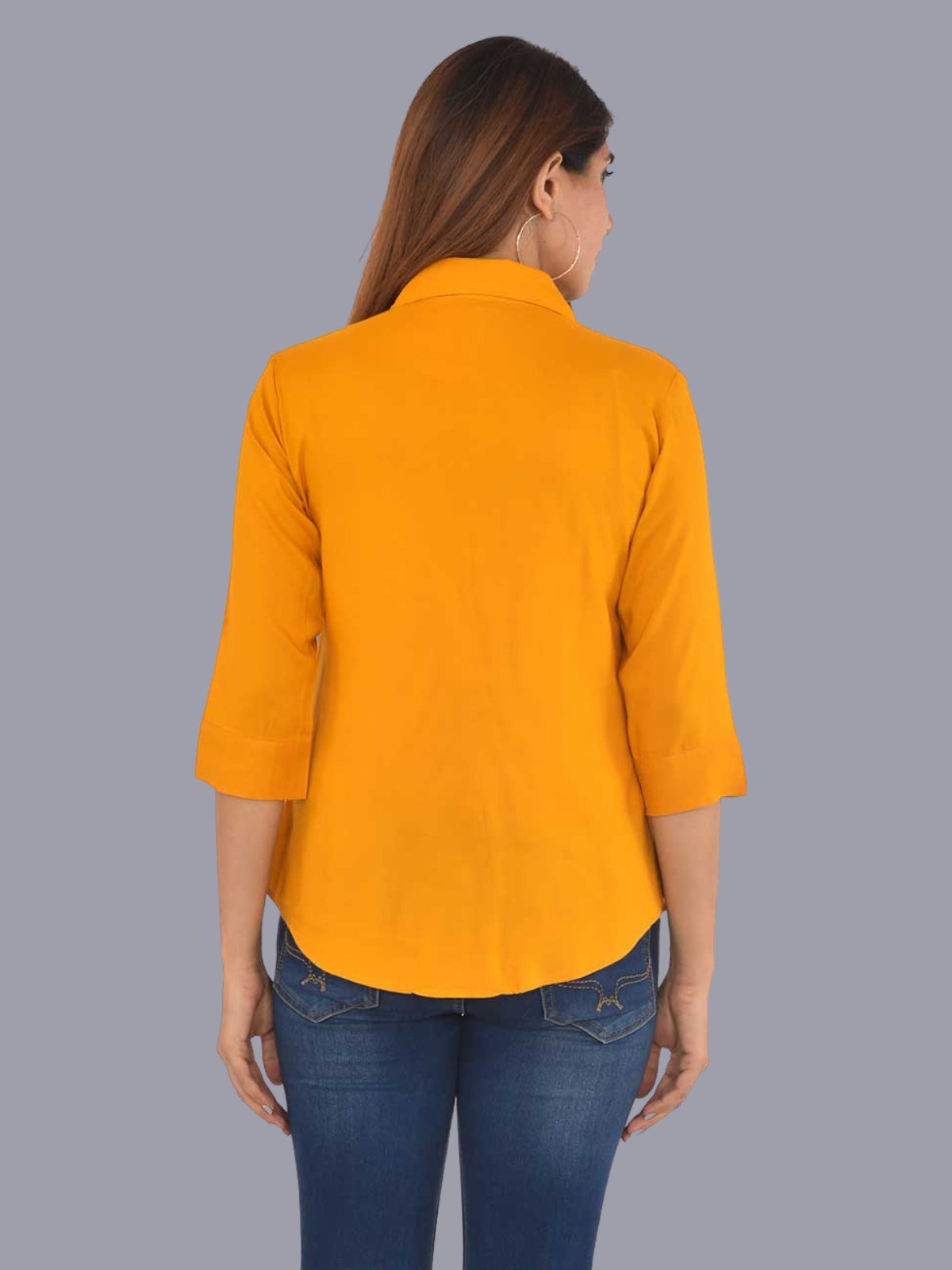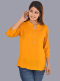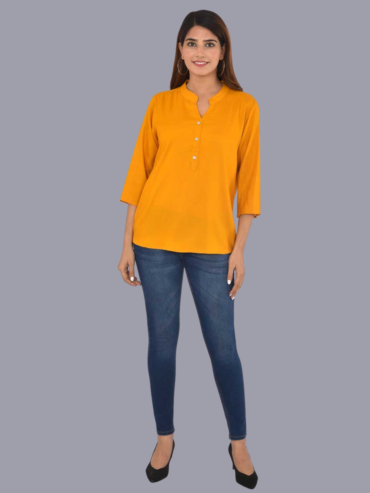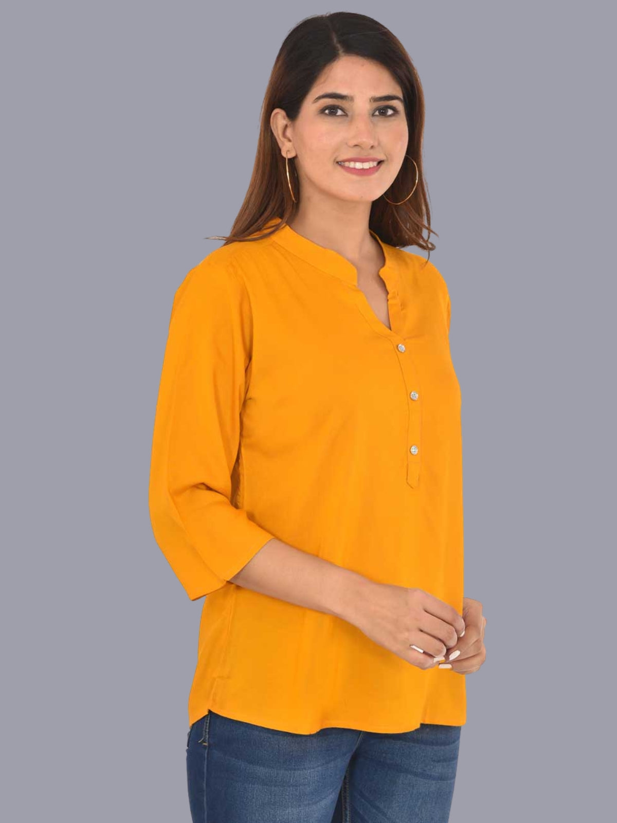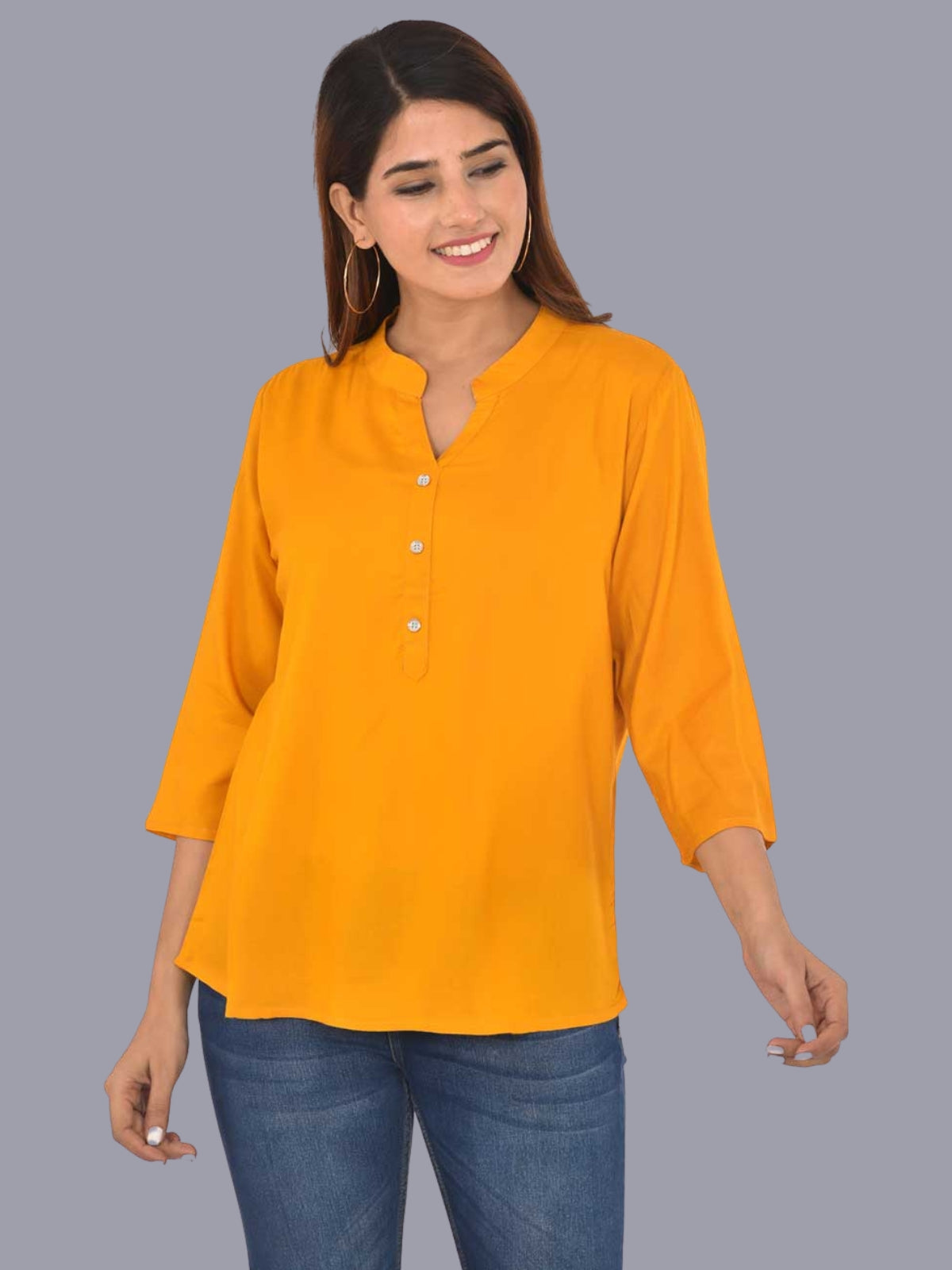 Womens Solid Yellow Chinese Collar Three Fourth Sleeve Rayon Tops