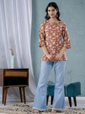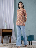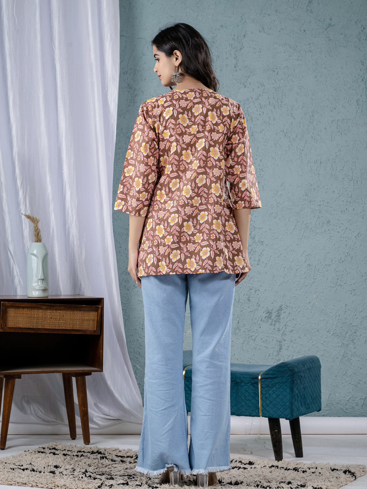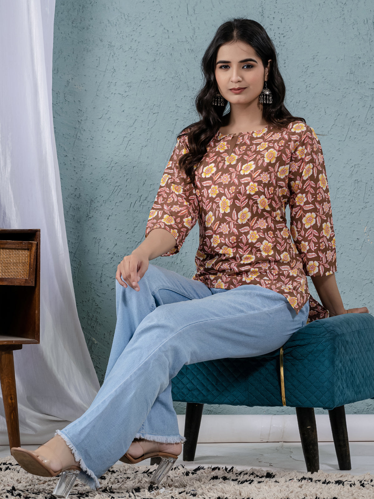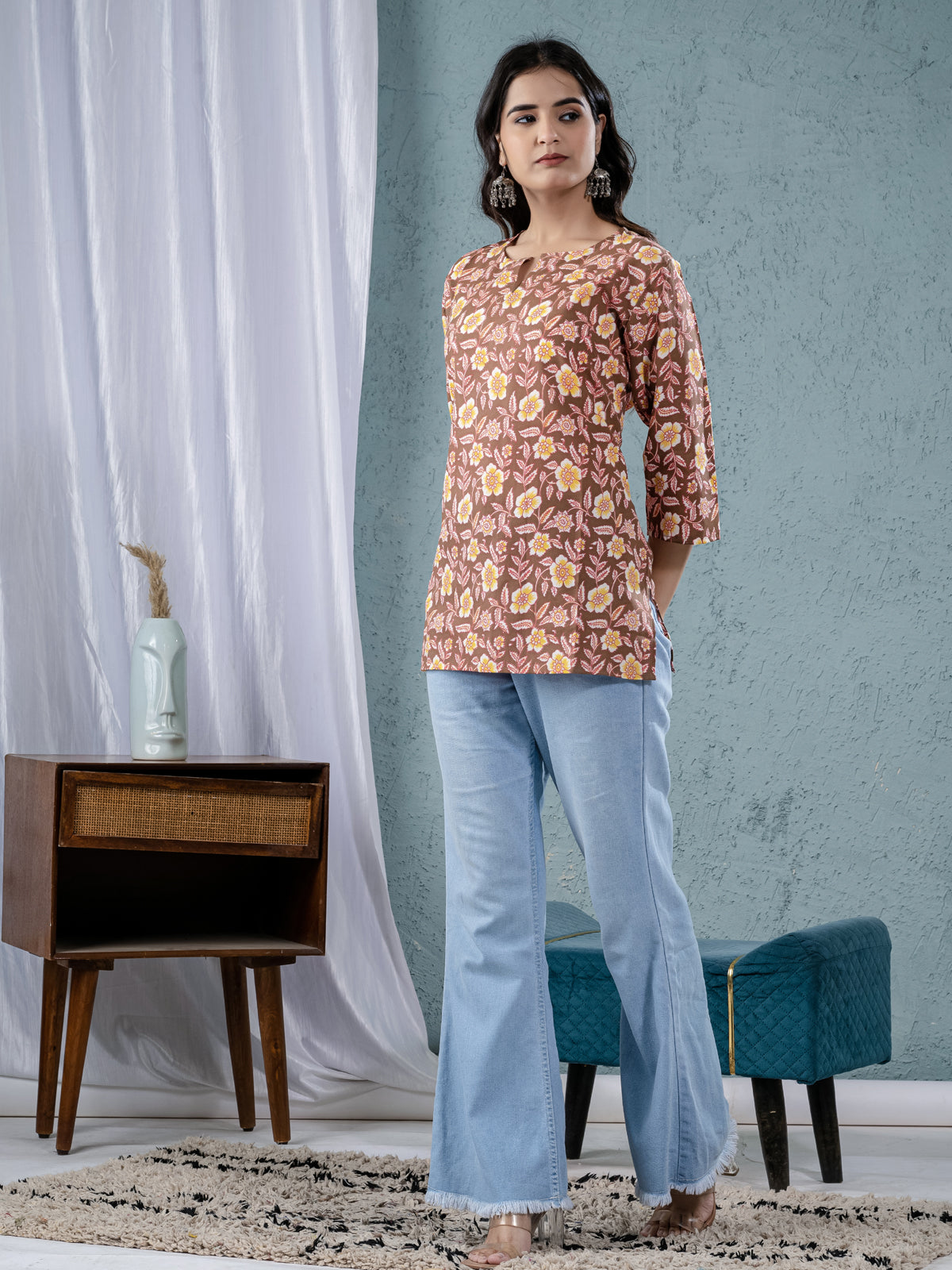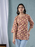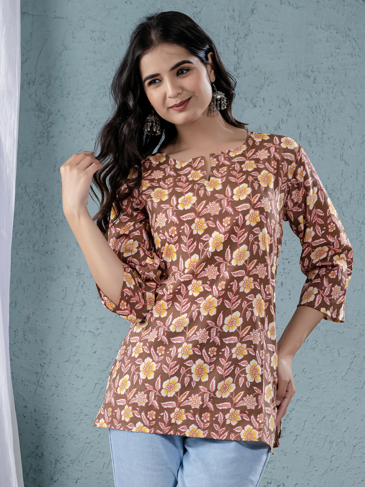 Our women's short kurti with a floral print is elegant and perfect for both formal and casual settings. This stylish top adds an updated touch to its classic appeal with its round neckline and flattering V-shape. Its stylish appearance and all-day comfort are guaranteed by its soft, breathable fabric construction. The 3/4 sleeves offer a well-balanced combination of style and comfort, making it ideal for festive occasions, outings, and office wear. This kurti's hip-length cut goes well with leggings, jeans, or palazzos. It is a wardrobe essential because of the vivid floral print, which adds to its feminine appeal. This adaptable and fashionable floral kurti will enhance your fashion statement. For the ideal fit, it comes in a variety of sizes!